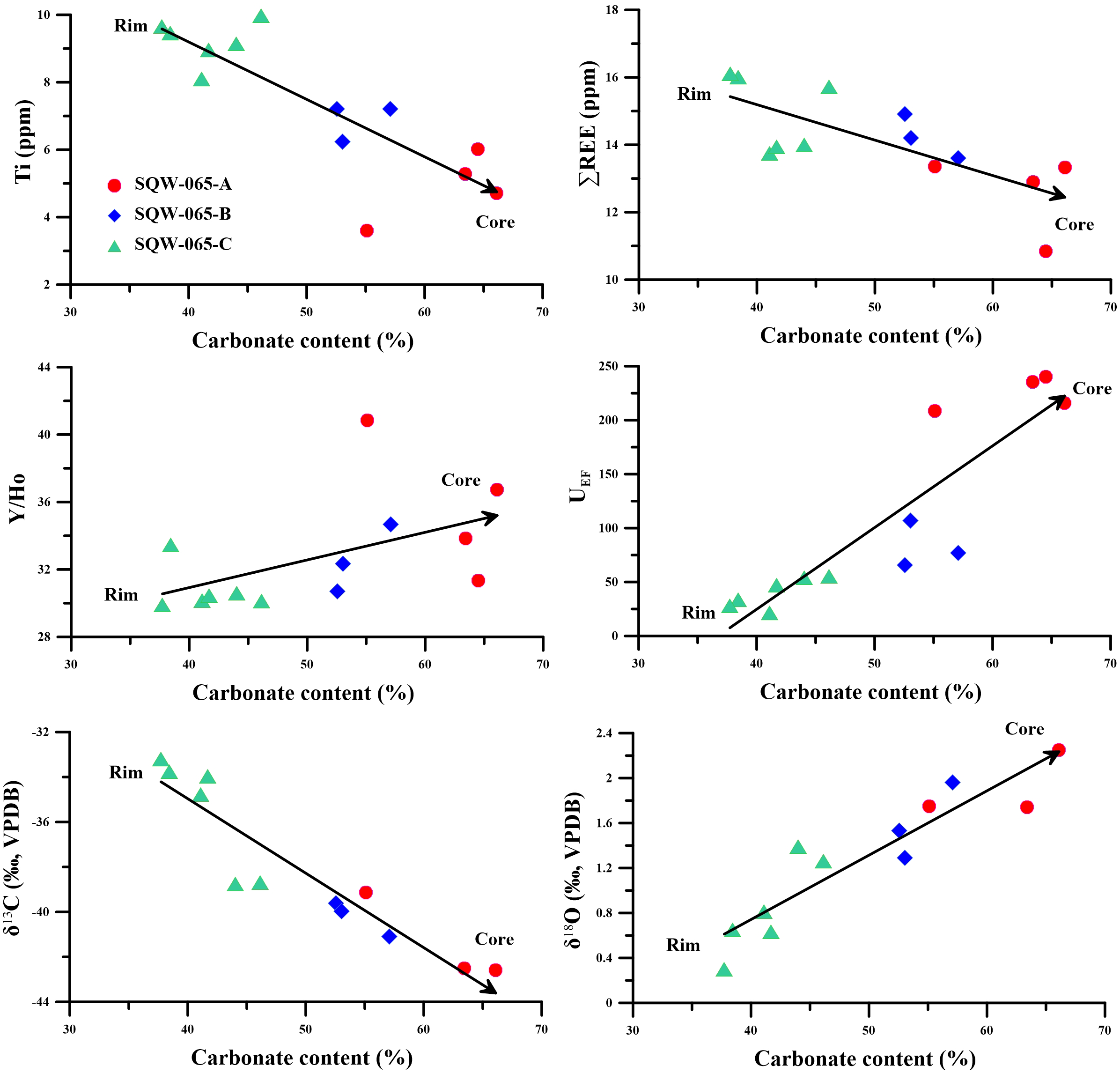 Trends of carbonate contents and Ti, ∑REE, Y/Ho, and UEF of the tubular carbonate from the periphery to inner portions.