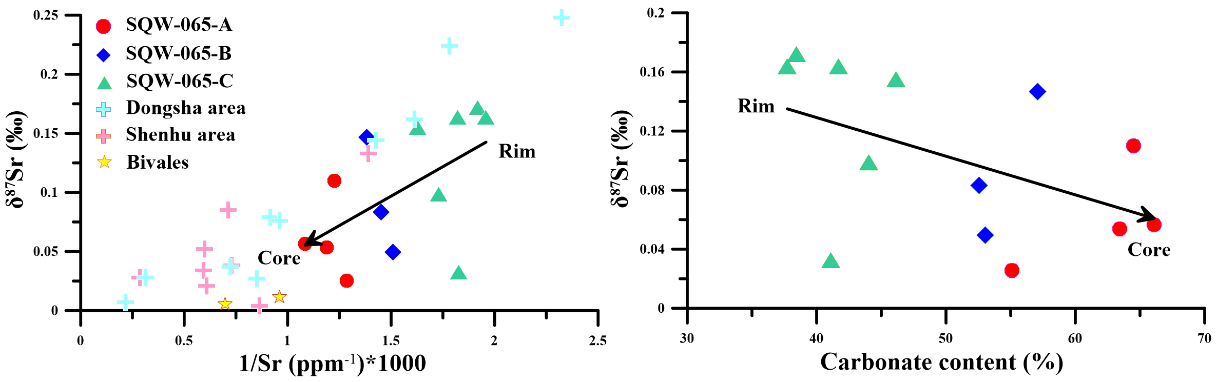 δ87Sr-1/Sr*1,000 and δ87Sr-carbonate content diagram of the carbonate samples. Dongsha (Ge et al., 2020), Shenhu (Ge et al., 2020), SQW-65 (this study).