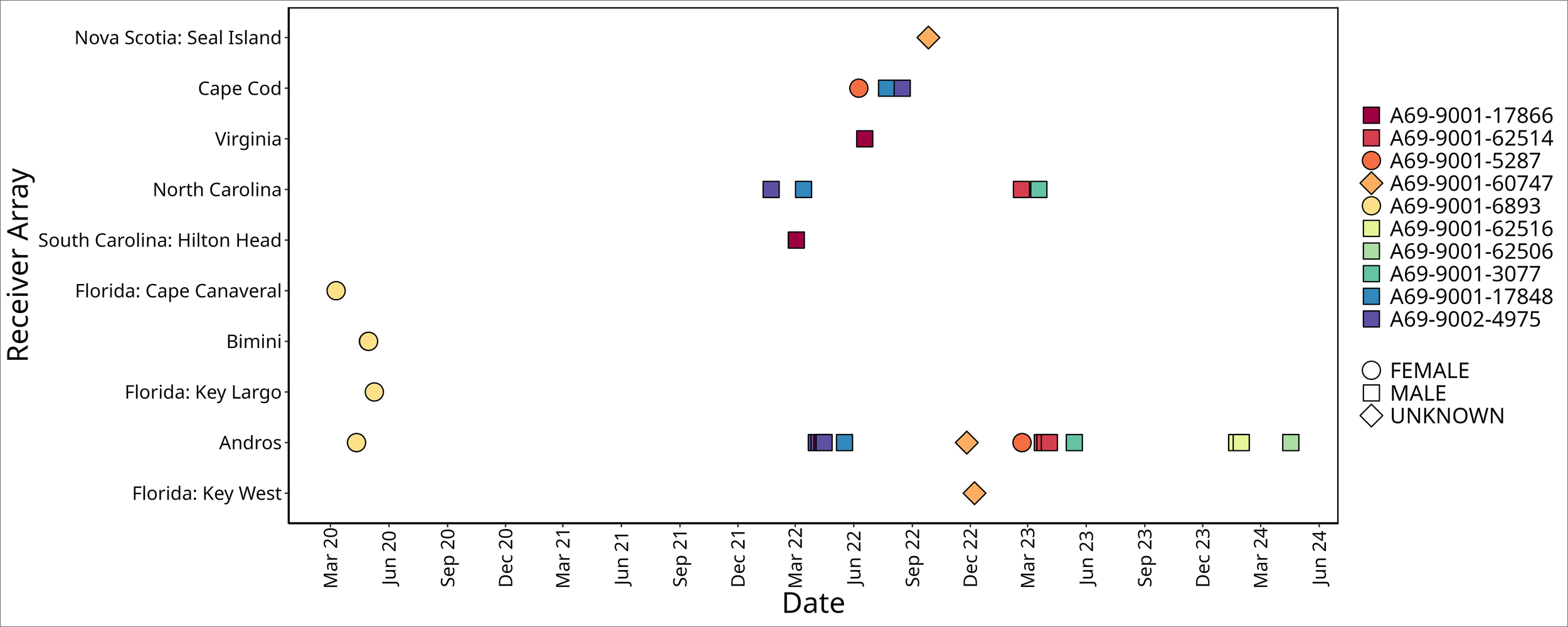 Time series of acoustic detections for all ten white sharks, Carcharodon carcharias, prior to, during, and after detections on Andros Island receivers. Detection data from other receiver arrays, ordered by latitude, were provided via the Ocean Tracking Network. Point shape denotes sex; point fill color denotes animal ID.