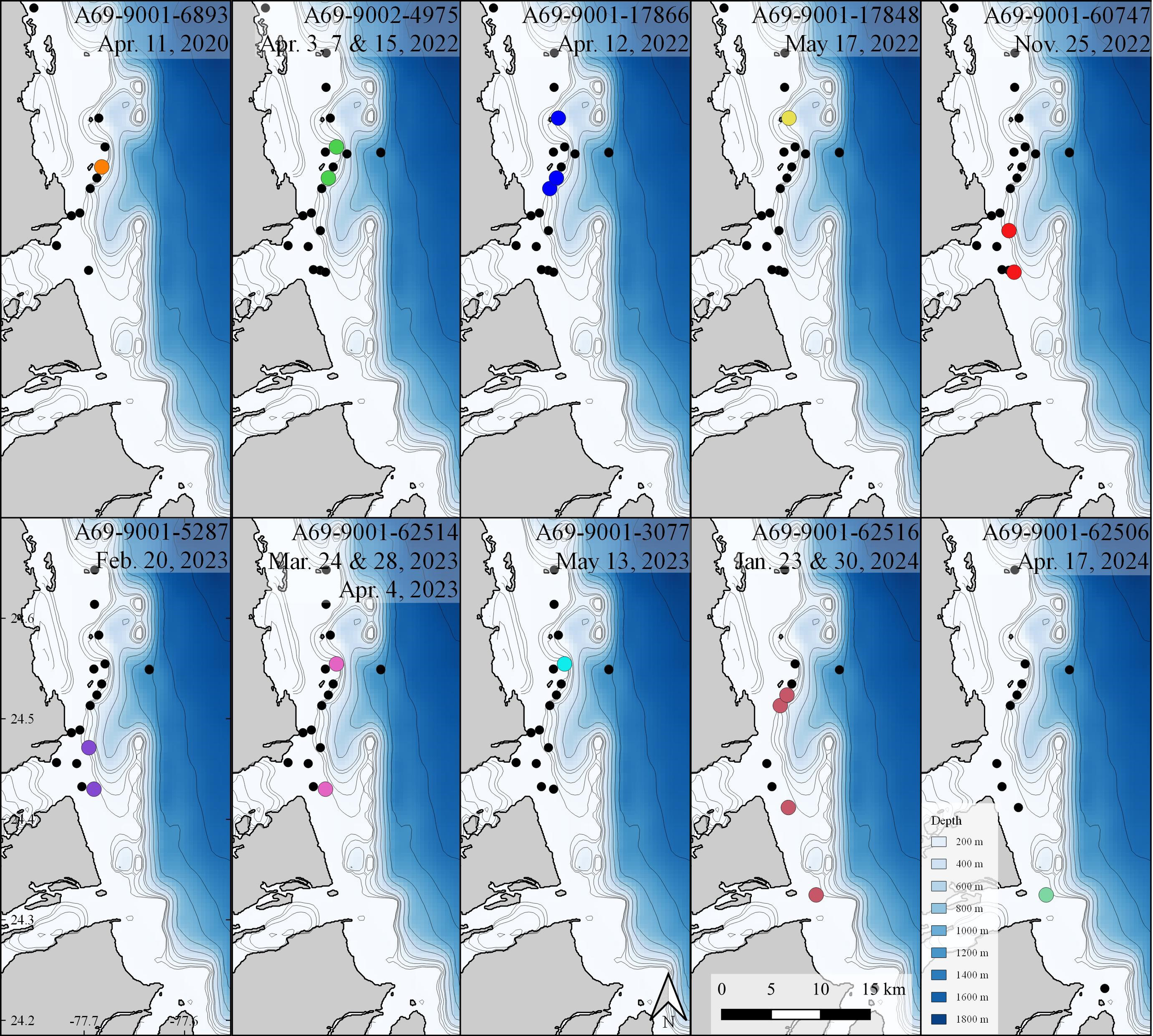Acoustic detections of all white sharks (n=10), Carcharodon carcharias off Andros Island, The Bahamas. Black dots indicate locations of acoustic receivers where white sharks were not detected.