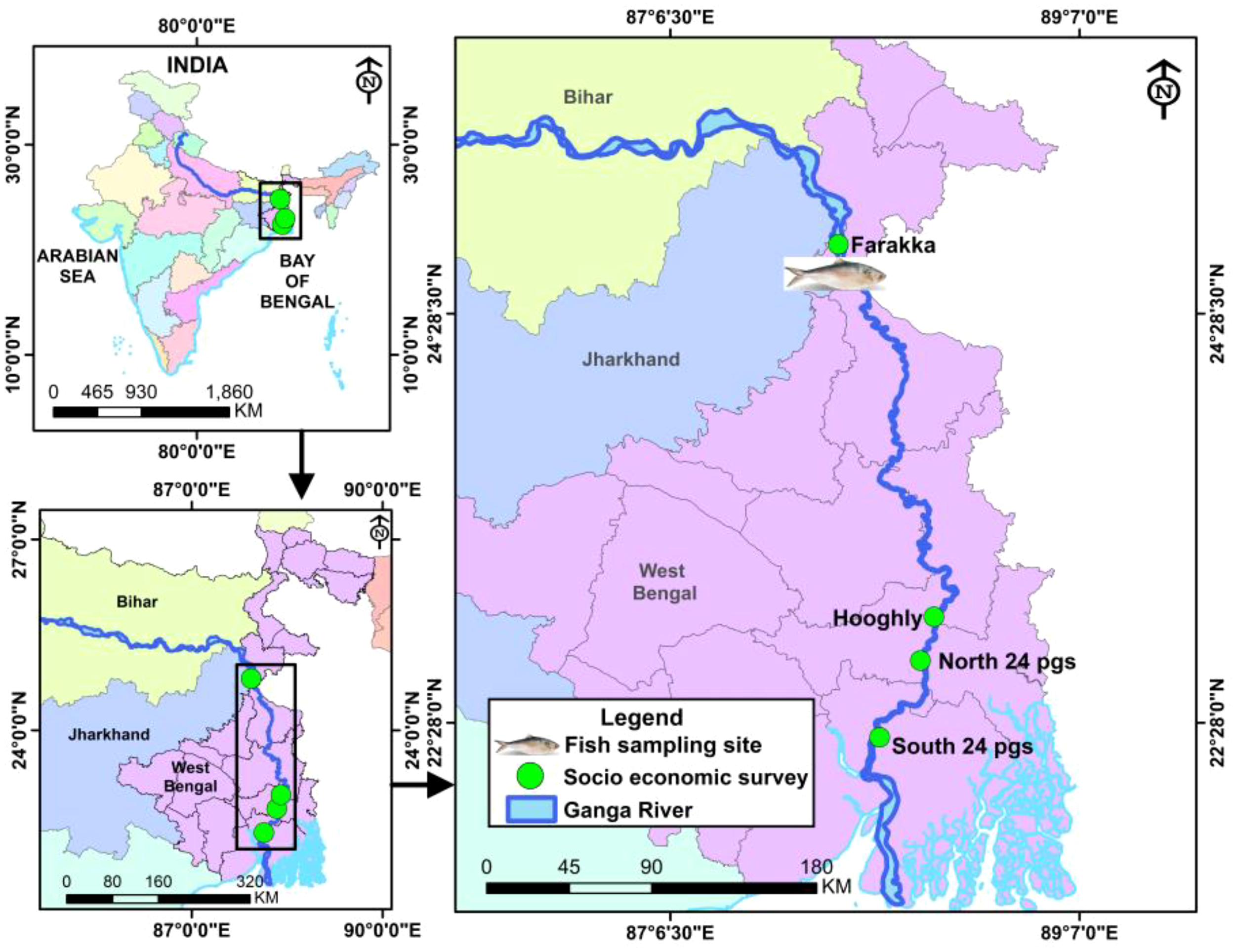 River Ganga (2,525 km) in India splits into two sections in West Bengal: the Hooghly portion, which flows from Farakka to West Bengal, and the Ganga portion, which flows from Farakka to Bangladesh as river Padma. Hilsa migrates in the Ganga river, from the lower stretch to the upper stretch (up to Farakka, Murshidabad, West Bengal) for breeding purposes. Two types of sampling were done here, like fish sampling, which was done at Farakka, Murshidabad, West Bengal, from River Ganga. Another data collection of Hilsa consumption was surveyed from Hilsa fishers in four primary sampling sites in four districts: North 24 Parganas (22°47′21.85″N; 88°20′8.99″E), South 24 Parganas (22°23′44.39″N; 88°8′14.57″E), Hooghly (22°36’17.97″N; 88°21′53.13″E), and Farakka (24°48′1.34″N; 87°55′21.53″E), respectively (Figure 1).