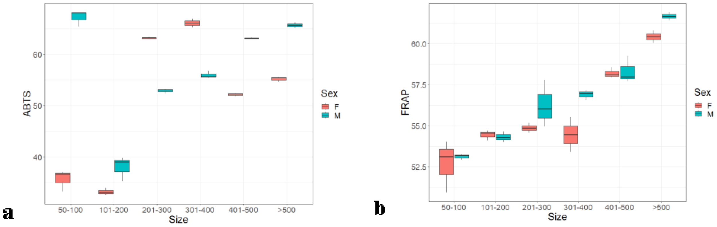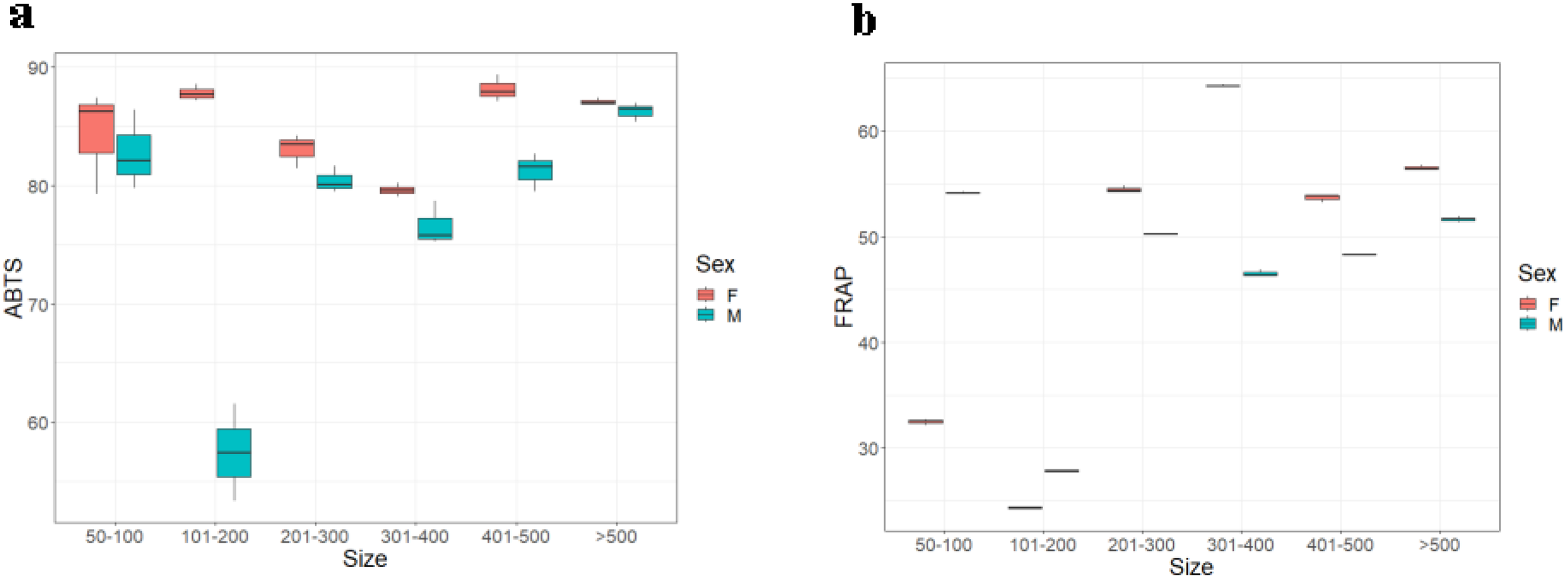 Liver antioxidants of male and female Hilsa, by the (A) ABTS and (B) FRAP methods (Group A includes weights ranging from 5 g to 100 g, Group B includes weights ranging from 101 g to 200 g, Group C includes weights ranging from 201 g to 300 g, Group D includes weights ranging from 301 g to 400 g, Group E includes weights ranging from 401 g to 500 g, and Group F includes weights above 500 g).