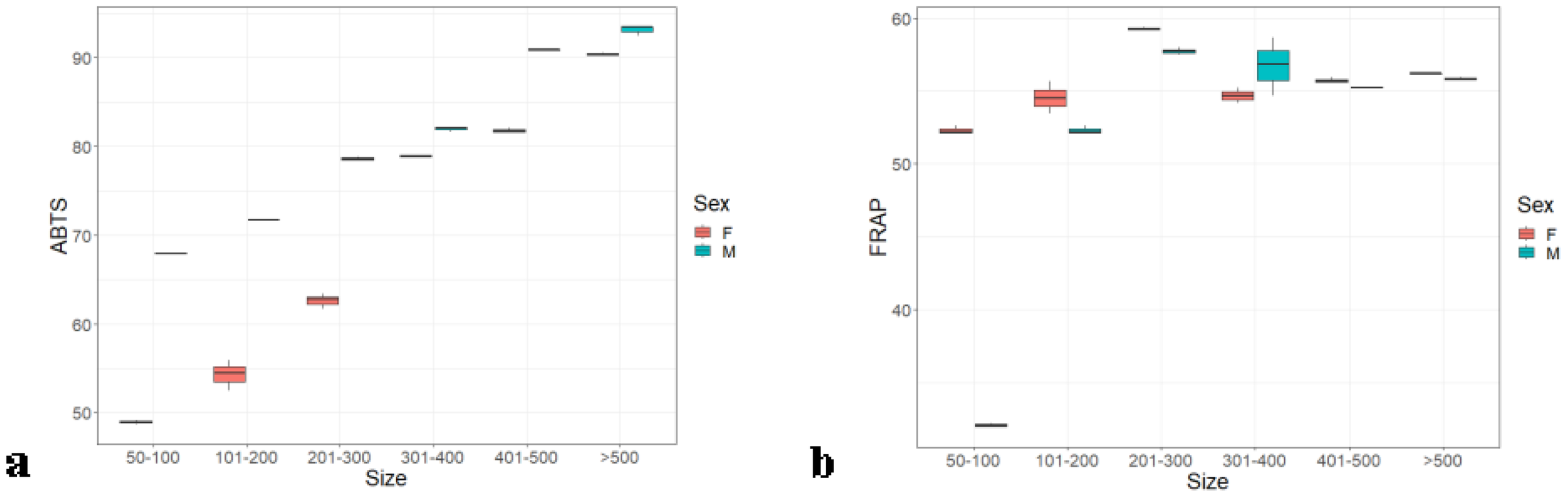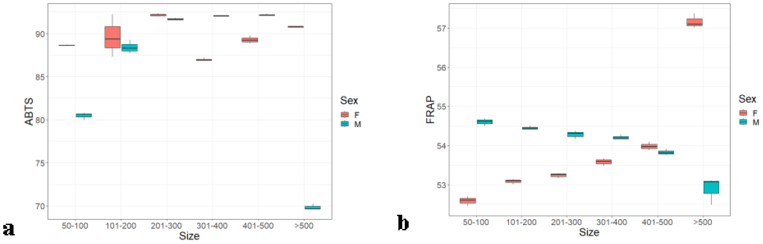 ABTS free radical scavenging is a standard universal method used commonly to measure antioxidant activities (Binsan et al., 2008) in Litopenaeus vannamei, which is reduced by an antioxidant (Miller et al., 1993); its an antioxidant that can lower the relatively stable radical known as ABTS+ (Miller et al., 1993). In the present study, in the ABTS method, gut activity levels at all the time remained at more than 84% in all male and female age groups. Here, females in the gut showed more than 92% activity. A similar pattern was found in the kidney, liver, muscles, brain, gut, and gills, except for a few samples with more than 500 g of weight. This is consistent with other research papers that have reported higher antioxidant activity in females across various fish species. For instance, a study by Huang et al. (2005) discussed the presence of antioxidants in fish and their role in disrupting radical chain reactions and preventing the formation of reactive oxidants. Another study by Pramanik and Mohanty (2016) on antioxidant enzymes in different tissues of Indian Major Carp reported high in female fish. This might be because very few fish were available to test in this group.