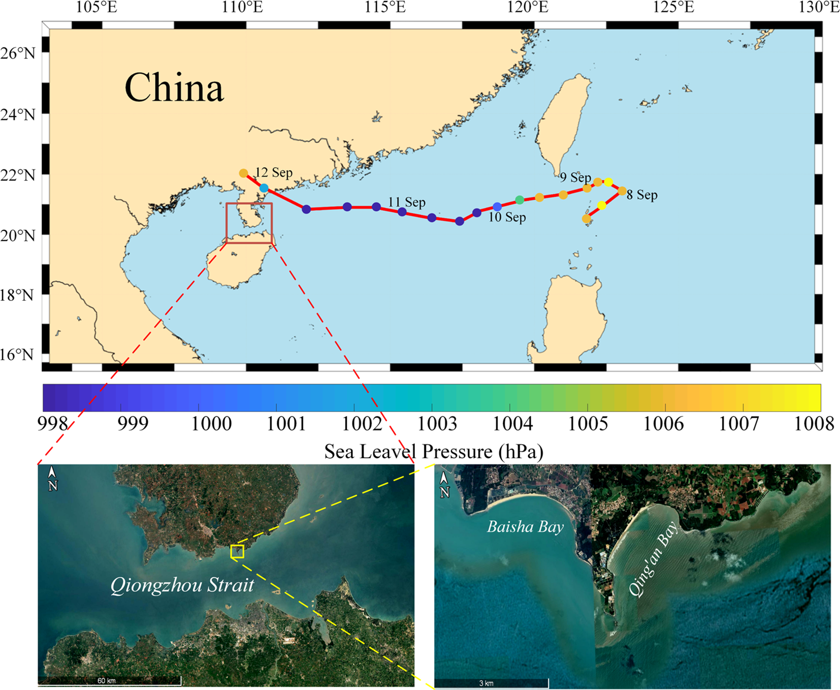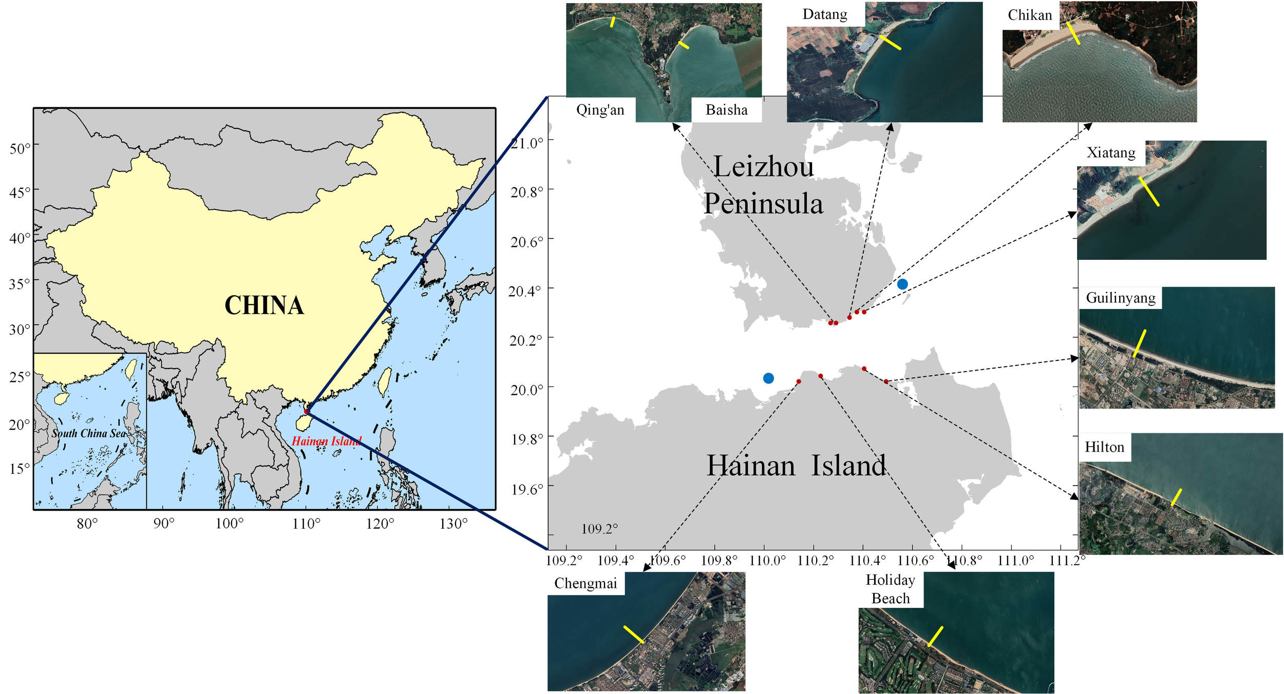 The Qiongzhou Strait is situated between the Leizhou Peninsula of Guangdong Province and Hainan Island of Hainan Province (19°52′–20°16′ N, 109°42′–110°41′ E), flanked by the Gulf of Tonkin to the west and the northern part of the South China Sea to the east. The strait lies in the southern part of the Leiqiong Graben Basin, a long and narrow rectangular basin oriented northeast-southwest. It has a central water depth of 80–100 meters, with flat terrain and shallow waters at its eastern and western entrances. The shoreline is jagged, featuring headlands and bays, predominantly with sandy beaches (Hu, 2022). Many shoreline segments along the strait are experiencing severe erosion, with annual erosion setbacks of up to several meters (Liu et al., 2007).
