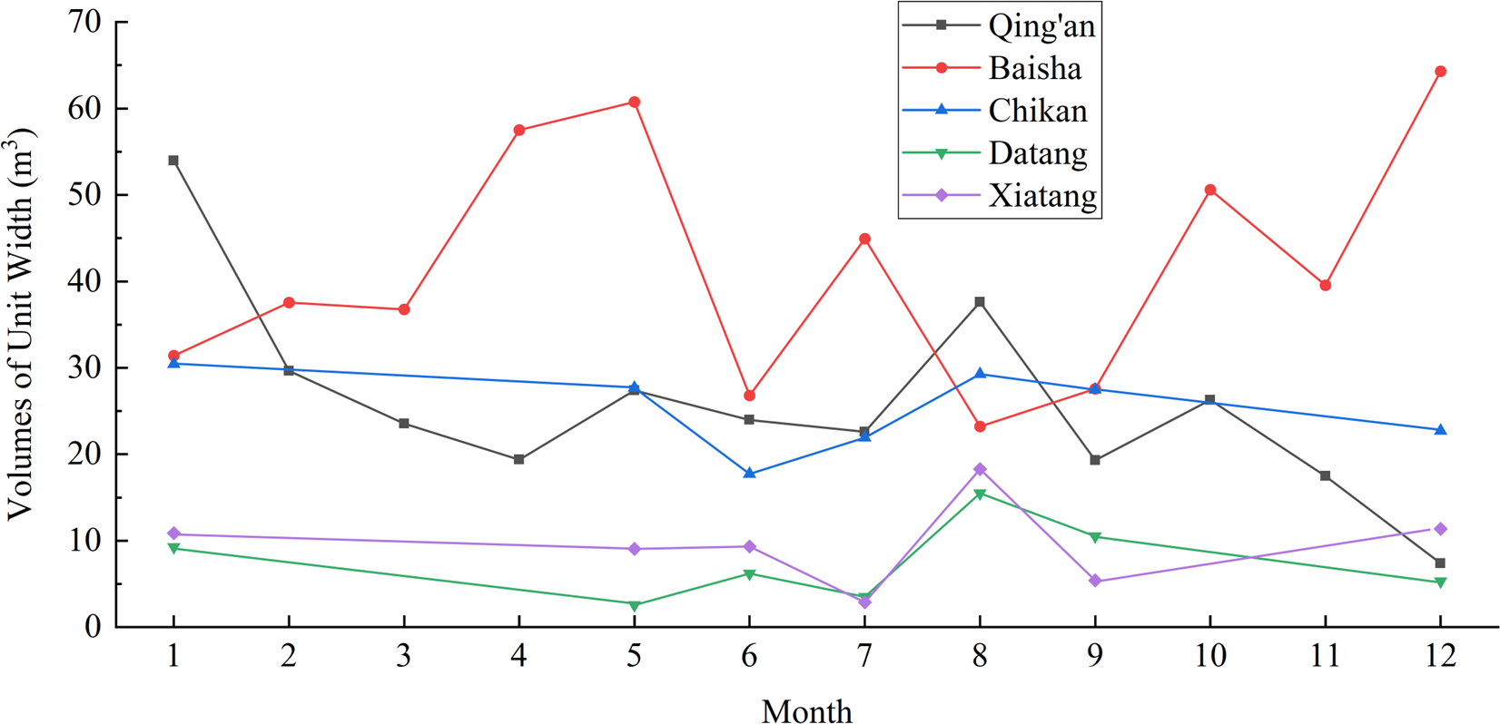 Changes in beach volume along the north coast of the strait are illustrated in Figure 2. Qing’an primarily exhibits a pattern of decreasing, then increasing, and then decreasing, whereas Baisha demonstrates an opposite trend of increasing, then decreasing, and then increasing. Notably, Qing’an experienced a significant trough during March-May and a pronounced peak area during July–September, while Baisha showed a notable upward trend and a significant peak area during March-May. Chikan Bay and Datang Bay generally undergo a decrease followed by an increase and then another decrease. Similarly, Xiatang Bay exhibits a decrease followed by an increase, then a decrease, and finally another increase. These areas, including Chikan, Datang, and Xiatang, display a significant peak in July-September.