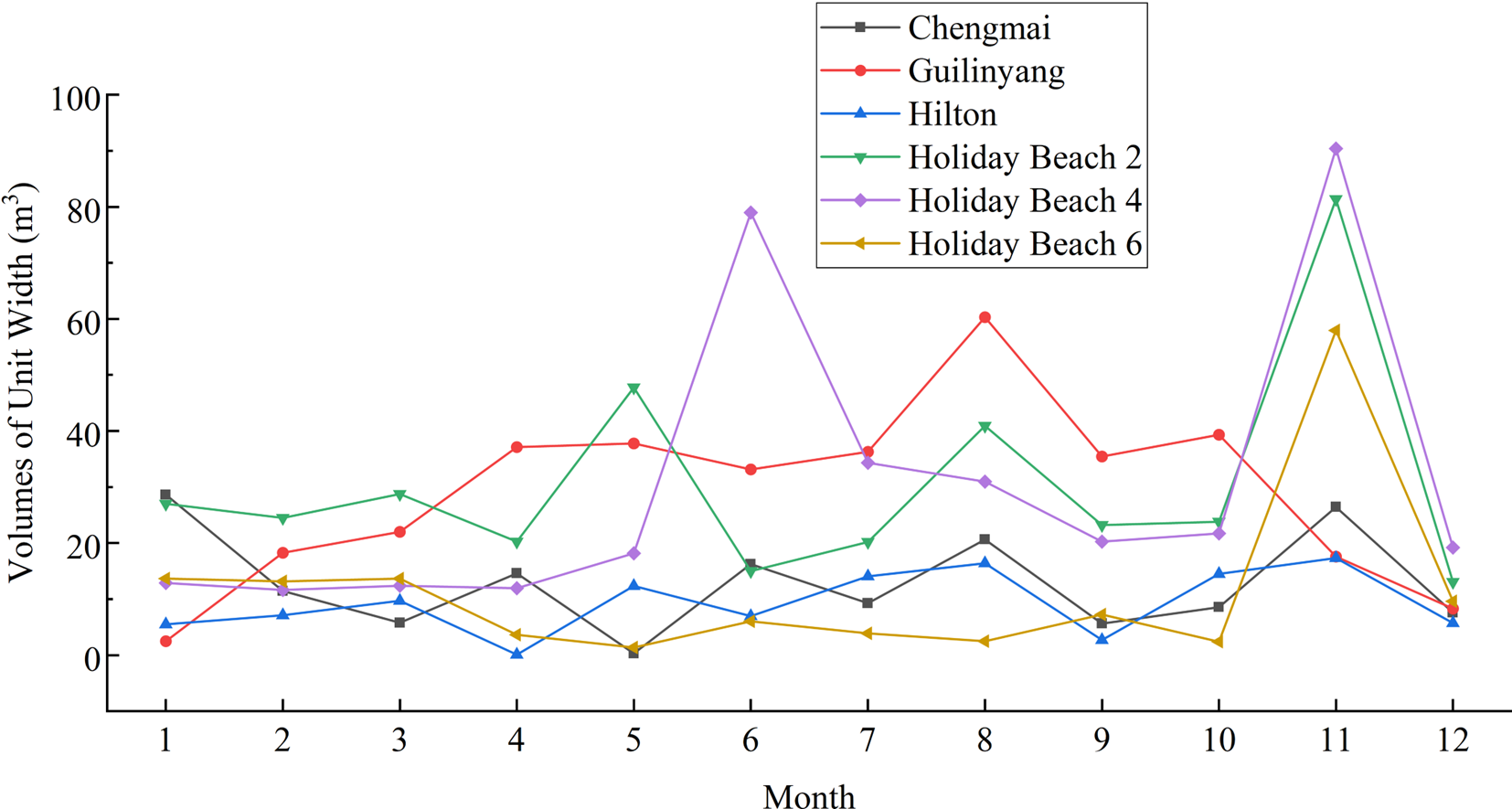 Changes in beach volume along the south coast of the strait are depicted in Figure 3. Chengmai Bay and Hilton Beach both exhibit a multi-peak trend overall, with a notable peak area appearing in October-December. Guilinyang Beach shows an overall increase followed by a decrease, with a significant peak observed in July-September and a smoother change in April-July. Notably, during the March-July period, Chengmai Bay and Hilton Beach display three opposite trends, where Chengmai Bay shows a peak while Hilton Beach shows a trough, and vice versa. Holiday Beach 2 and Holiday Beach 4 display multiple peaks, with Holiday Beach 2 showing significant peak areas in April-June and October-December and Holiday Beach 4 showing a significant peak area in October-December. Holiday Beach 6 exhibits a generally smoother profile with occasional peaks. Furthermore, it is noteworthy that Holiday Beach 3 profiles all demonstrate the same trend in October-December, with each showing a peak during this period.