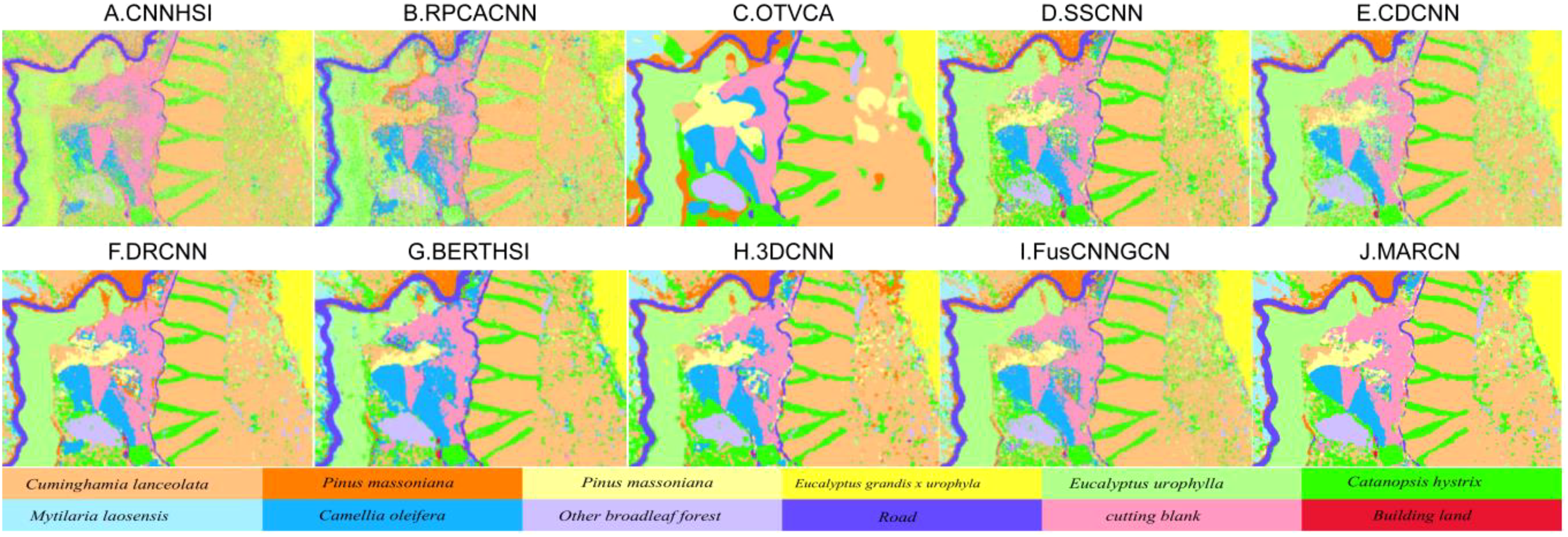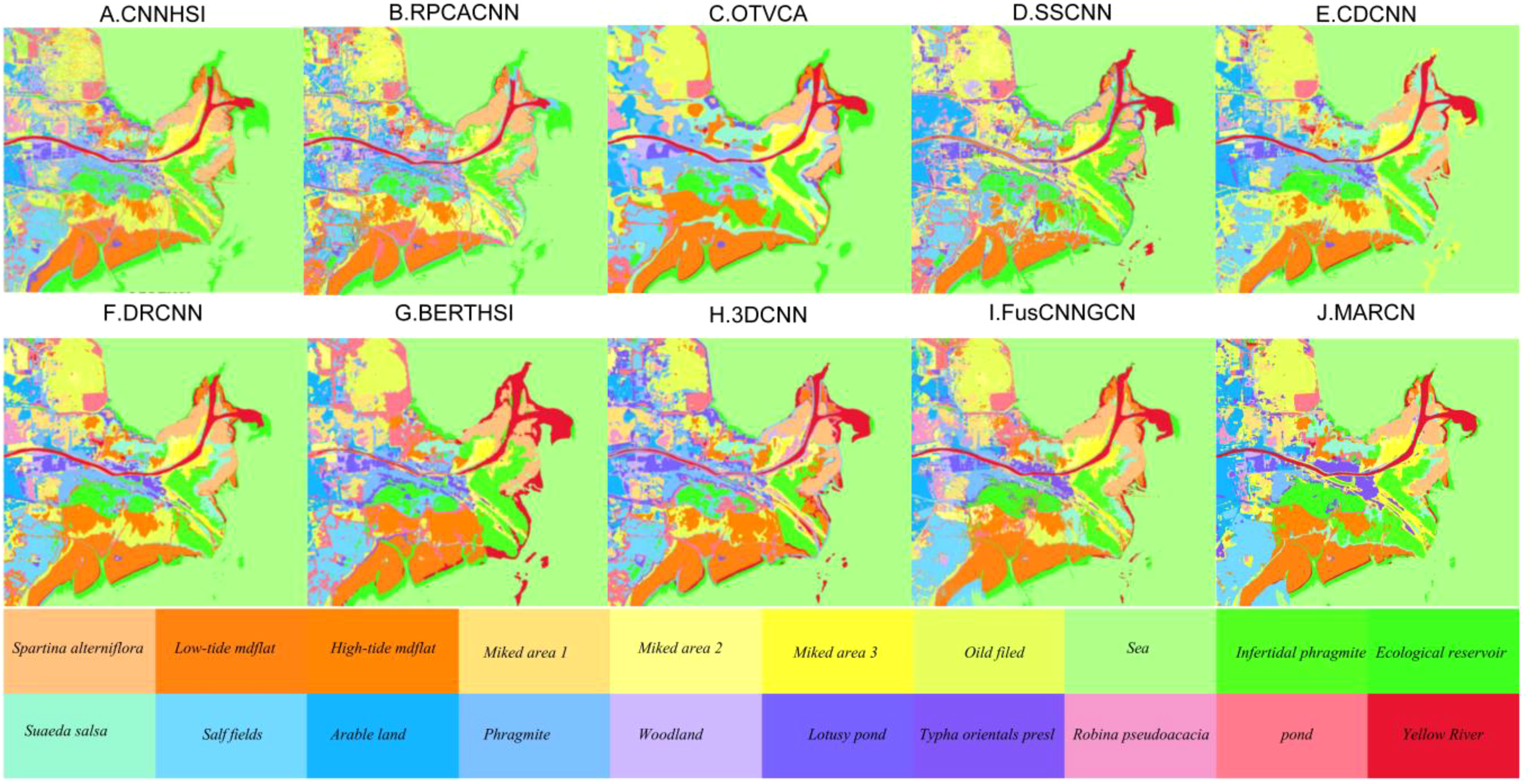 In this section, the Yellow River Estuary (YRE) and the Gaofeng State Owned Forest Farm (GSOFF) hyperspectral datasets are used to evaluate the effectiveness of the proposed MARCN. The GSOFF dataset, as an extended dataset, is used to verify the generalization ability of this algorithm. First, the YRE and the GSOFF datasets are introduced, second, ablation experiments are conducted to verify the effectiveness of MARCN, and finally, several state-of-the-art conventional algorithms are used to compare with the proposed MARCN algorithm to verify the efficiency of the proposed algorithm MARCN.