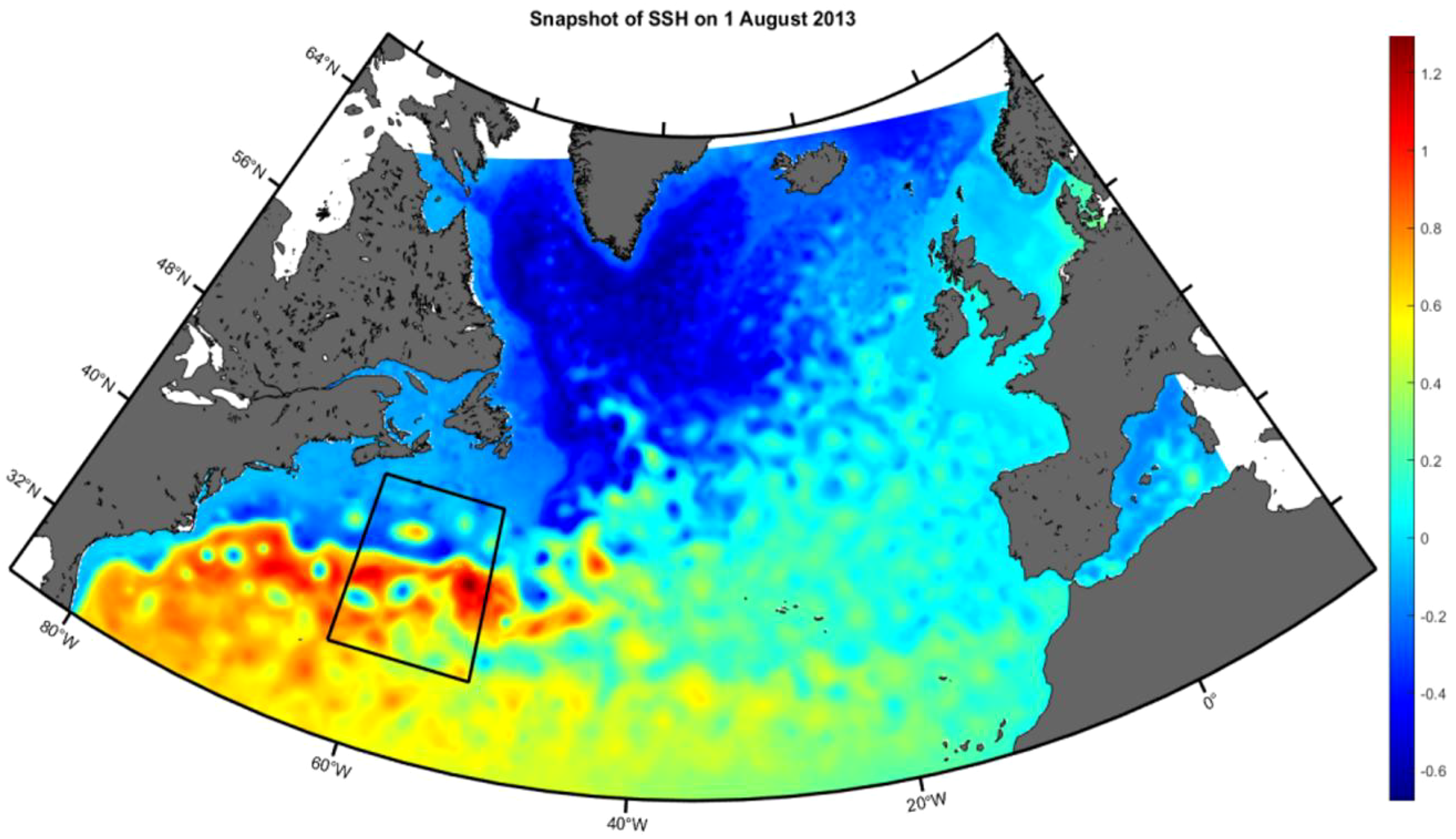 NATL60 domain and the daily-mean SSH (m) snapshot for August 1, 2013. The black nested rectangle delineates the dynamic Gulf Stream region, with a side length of 1000 kilometers and centered at coordinates (-57.5, 38.5).