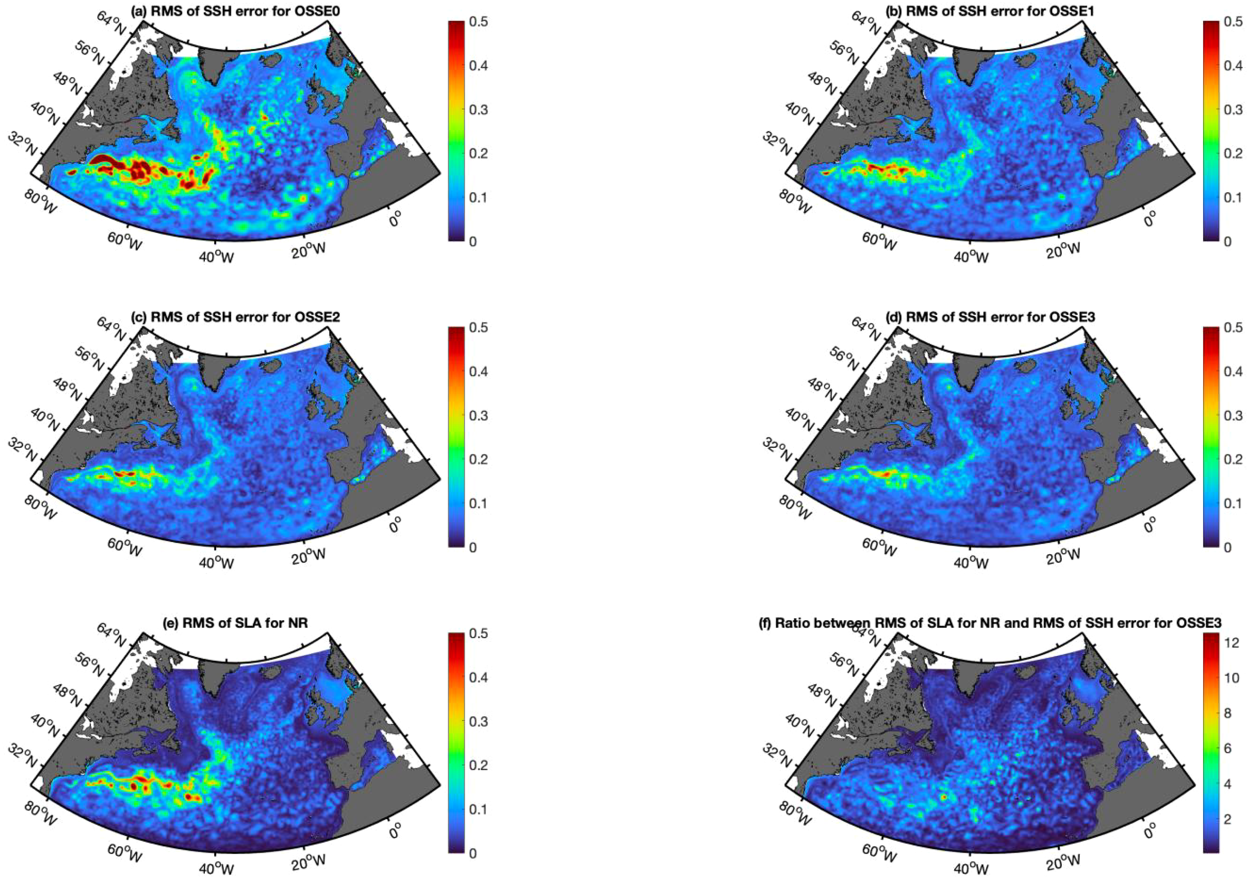 RMS of SSH error comparing the NR and OSSEs: (A) OSSE0 (FREE), (B) OSSE1 (STD), (C) OSSE2 (SWOT), (D) OSSE3(SWOT+NADIR). (E) RMS of the SLA for NR (Unit:m) and (F) the Ratio between RMS of SLA for NR and RMS of SSH error for OSSE3.