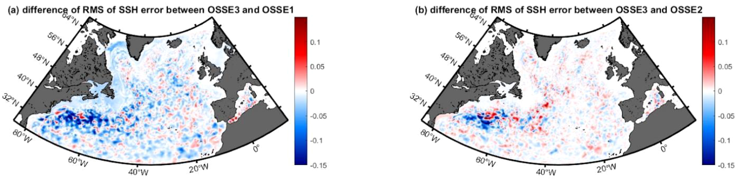 (A) shows the difference of the RMS of SSH error between OSSE3 and OSSE1, (B) difference of the RMS of SSH error between OSSE3 and OSSE2 (Unit:m).