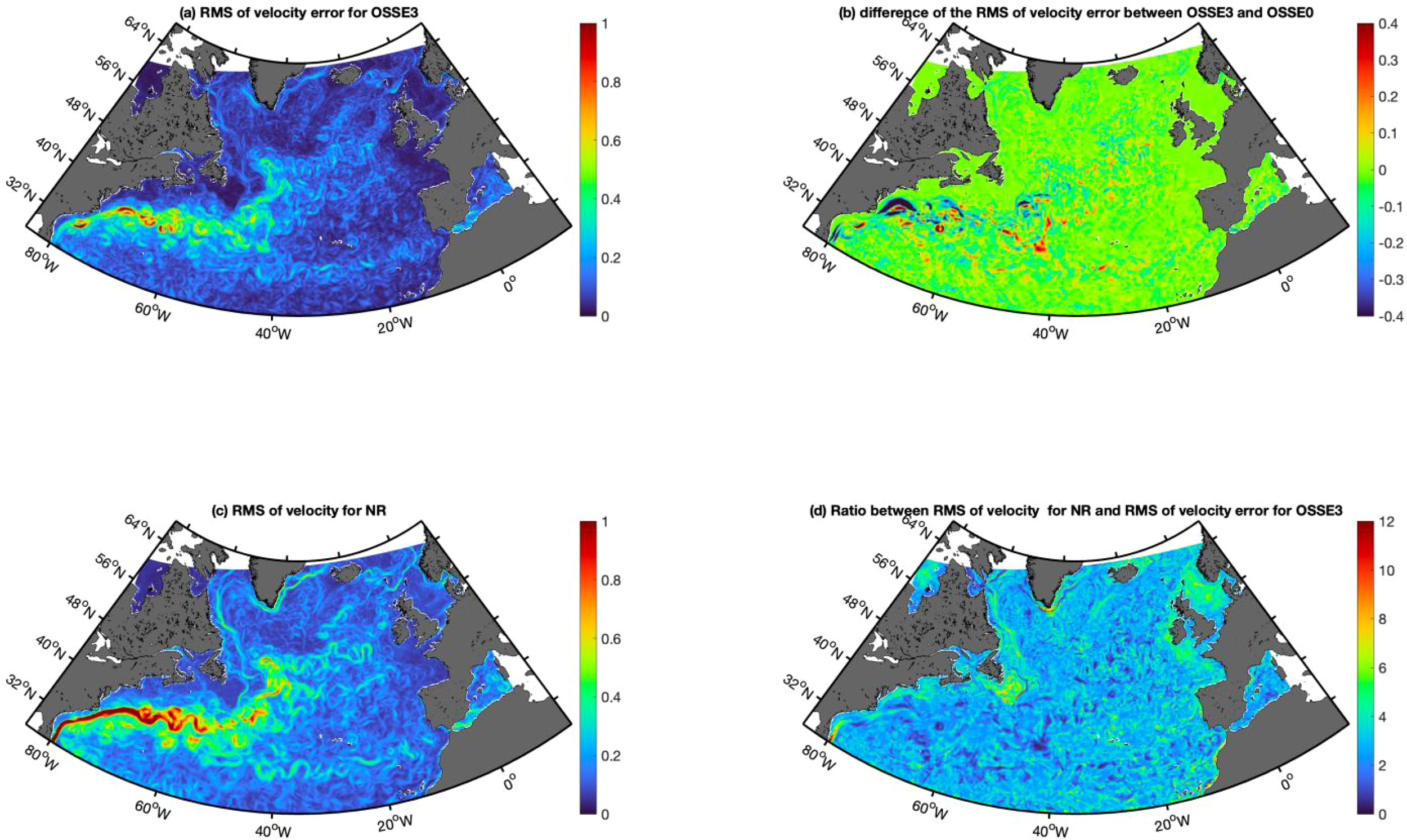 The objective of this section is to investigate the impacts of assimilating SSH data from SWOT versus two nadir altimeters. Over a one-year period, the RMS difference of SSH between the Nature Run (NR) and the Observing System Simulation Experiments (OSSEs) is calculated and displayed in Figure 2. This figure highlights significant variability in highly dynamic areas such as the Gulf Stream (GS). The impact of assimilating conventional observations (as compared to a free run) can be clearly seen when comparing OSSE1 to OSSE0, with a nearly 40% improvement in domain averaged RMSE (values of 11.38cm and 7.95 cm respectively for OSSE0 and OSSE1). When SWOT is assimilated in place of conventional nadir altimetry (OSSE2) a notable improvement in the Gulf Stream can be seen with a domain-averaged decrease in RMS differences down to a value of 7.08 cm (11% improvement). Among the OSSEs, OSSE3 (assimilating all observations) exhibits the most accurate performance, with the lowest domain-averaged RMSE value of 6.81 cm (14% improvement). Generally, the RMS errors indicate that discrepancies predominantly occur over the GS across all OSSE scenarios. As a reference, the domain-averaged RMS of the Mean Dynamic Topography (MDT) and the RMS of the Sea Level Anomaly (SLA) for OSSE0 are 22 cm and 9.2 cm, respectively, both of which are greater than the RMSE values for OSSE1-3.