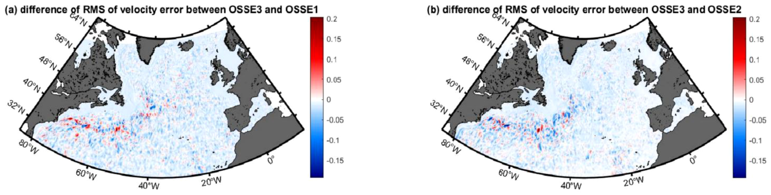 As shown, the differences among the OSSEs are shown in Figure 5. OSSE3 exhibits the most accurate performance, with OSSE2 performing marginally better than OSSE1, which can be clearly detected in Figure 5. Here, Figure 5A illustrates the reduction in RMS of velocity error between OSSE3 and OSSE1, indicating that assimilating SWOT data decreases the error compared to scenarios without SWOT data assimilation. Moreover, Figure 5B compares the RMS of SSH error between OSSE3 and OSSE2. This reveals that incorporating data from both altimeters modestly enhances the predictive accuracy. The domain-average of Figure 5A is -0.73 cm/s and -0.56 cm/s for Figure 5B.