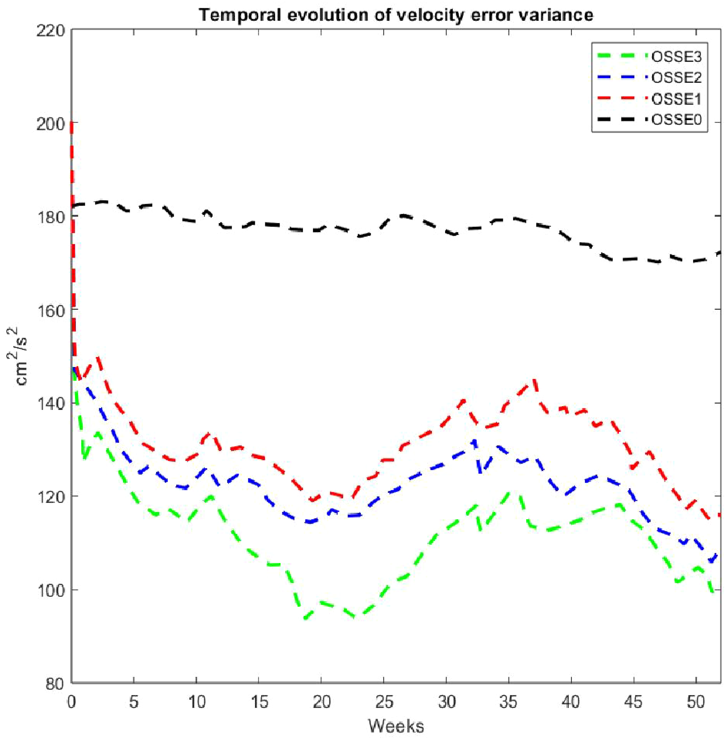 Figure 6 shows the temporal evolution of velocity error variance at a 15-meter depth over the whole year. OSSE0 (dashed black line), which is the free run, shows the highest RMS of SSH error, starting above 200 cm²/s² and gradually decreasing but remaining above 160 cm²/s². All the OSSE1–OSSE3 simulations exhibit similar seasonal variations. OSSE1 (dashed red line) starts with an RMS of SSH error around 180 cm²/s², dropping sharply in the first few weeks, then fluctuating between 120 and 150 cm²/s². OSSE2 (dashed blue line) follows a similar trend to OSSE1 but generally has a lower RMS of SSH error, ranging between approximately 110 and 140 cm²/s². OSSE3 (dashed green line) shows the lowest RMS of SSH error overall, starting around 160 cm²/s² and steadily decreasing, often falling below 100 cm²/s² towards the end of the observation period. The temporal evolution of velocity error variance clearly demonstrates that OSSE3 consistently maintains the lowest error variance, as expected, because it assimilates all available data, including both SWOT and nadir altimeters. While OSSE2 (SWOT-only) shows lower error than OSSE1 (using two nadir altimeters), indicating that if we had to choose between two nadir altimeters and one SWOT, we should choose SWOT. Thus, OSSE3 remains the best scenario overall because it assimilates all data sources.