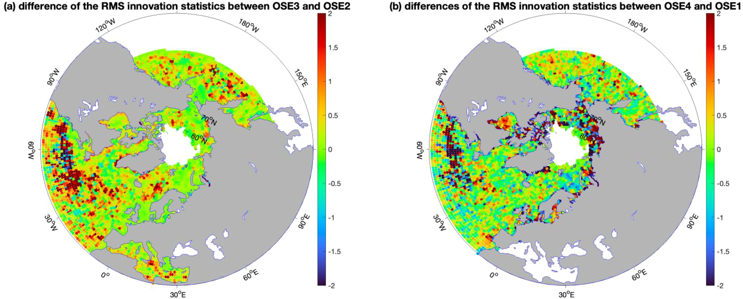 In Section 4, it was shown that the assimilation of SWOT in addition to conventional altimetry with two nadir altimeters (OSSE3 compared to OSSE1) provided an improvement of 14% in the RMS errors of SSH as compared to the experiment assimilating conventional observations only. First, we would like to assess whether this improvement is found using the early-release SWOT observations. The differences in RMS innovation statistics for SLA for the different OSEs are presented in Figure 9. Comparison of OSE3 to OSE2 (equivalent to comparison of OSSE3 to OSSE1) shows a significant reduction in innovations throughout the model domain, consistent with the OSSE results presented in Section 4. While a domain-averaged reduction in RMS of 6.2% is found, this is somewhat smaller than found for OSSEs. This may be due to a combination of larger errors in early-release SWOT data and the assessment of impacts over the full domain. Nonetheless, this notable reduction in error suggests that approximations made as part of the OSSE setup were appropriate and that results from the OSSEs may be transferable to real-world applications. Additionally, reductions outside the domain of NATL60 can now be seen as well, with smaller innovations in the Greenland-Iceland-Norwegian Seas, the Beaufort Sea and in the Pacific Ocean sector. Note that there are several small isolated areas of degradation in the highly-energetic Gulf Stream region. These are not statistically significant and may simply be spurious errors due to the short period of the assessment.