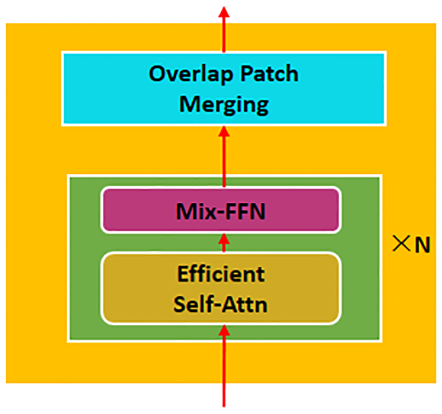 The encoder in the SegFormer network structure consists of four transformer blocks, as shown in Figure 4. Firstly, to reduce the computational cost, the efficient attention mechanism (Efficient Self-Attn) in the transformer block uses the sequence reduction process in the PVT (Xie et al., 2021). Subsequently, to alleviate the impact of positional encoding on accuracy, a mix feed-forward network (Mix-FFN) is introduced. It utilizes zero padding to record the location information (Islam et al., 2020) and a 3 × 3 convolution layer in the FFN. The 3 × 3 convolution can provide positional information for the transformer, reduce the number of parameters, and improve the computational efficiency. Finally, the patches are merged with overlap using the Overlapped Patch Merging to obtain the multilevel image features.