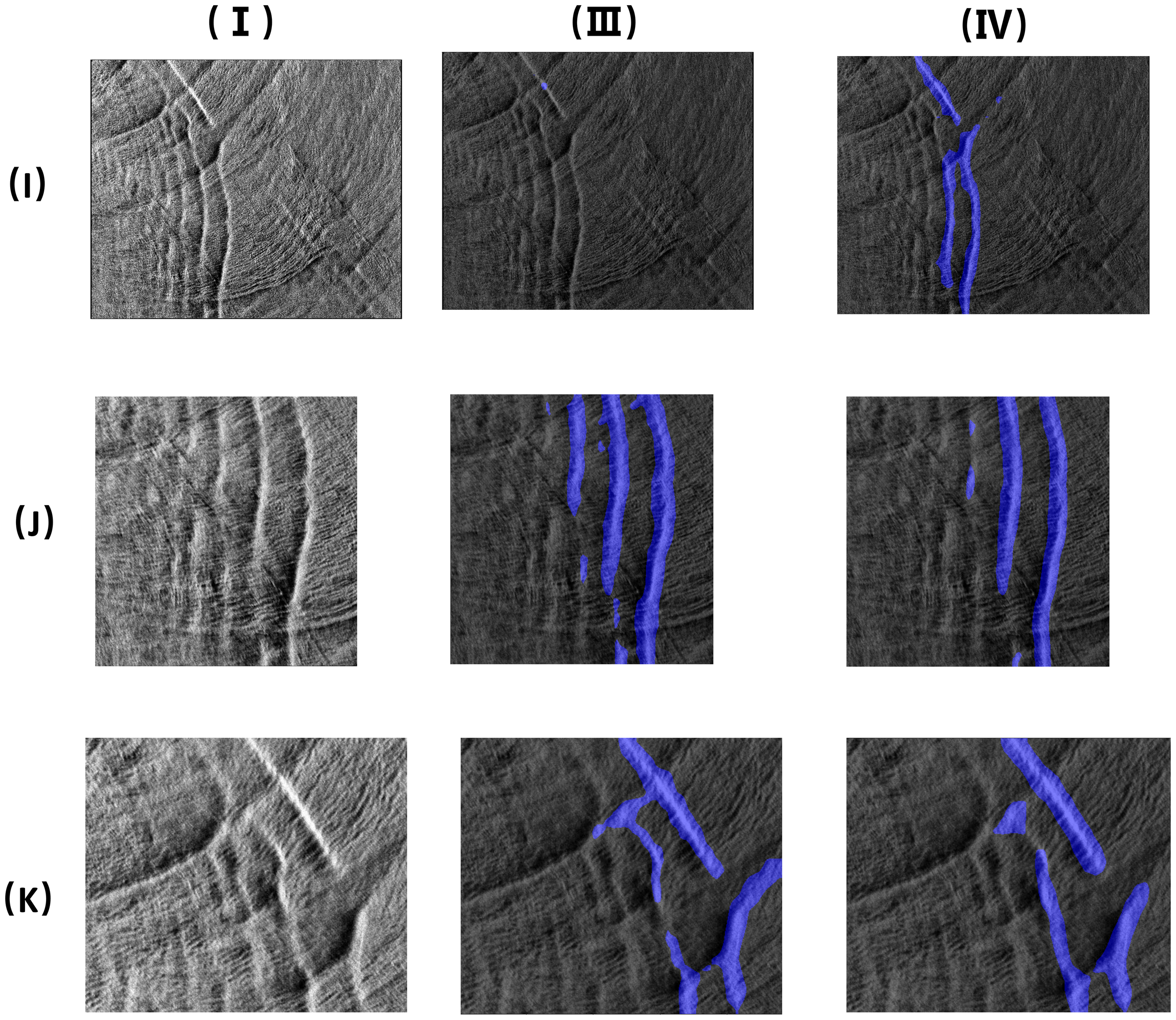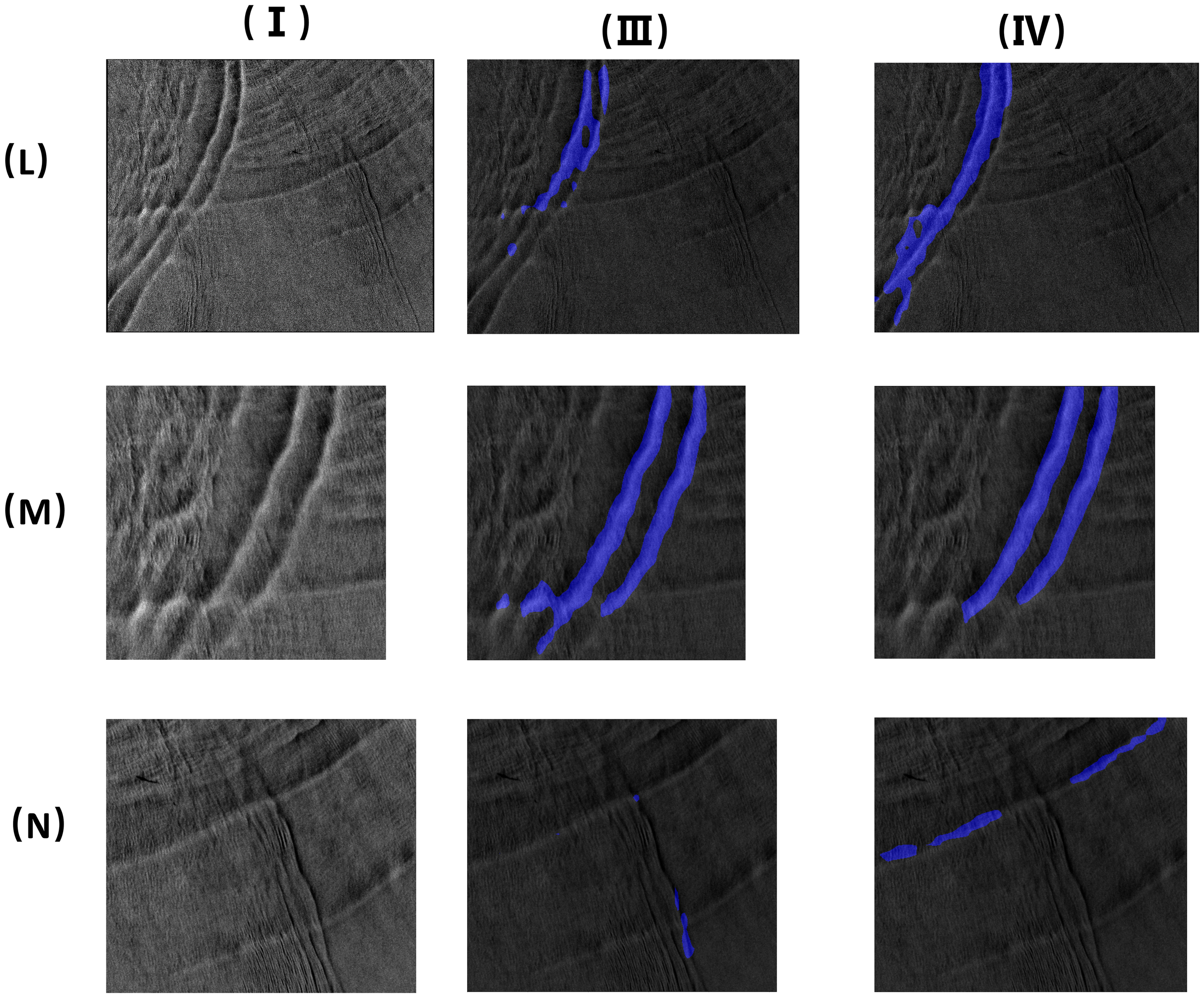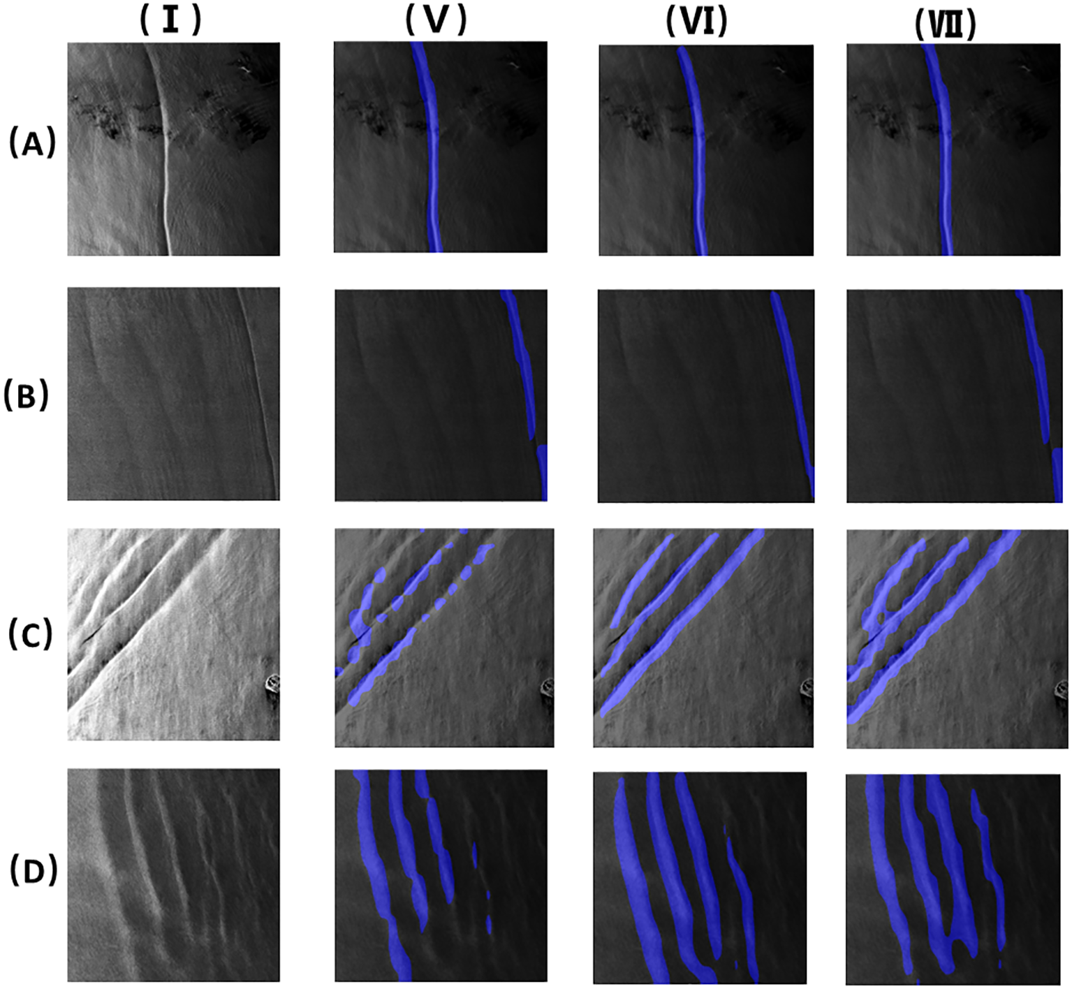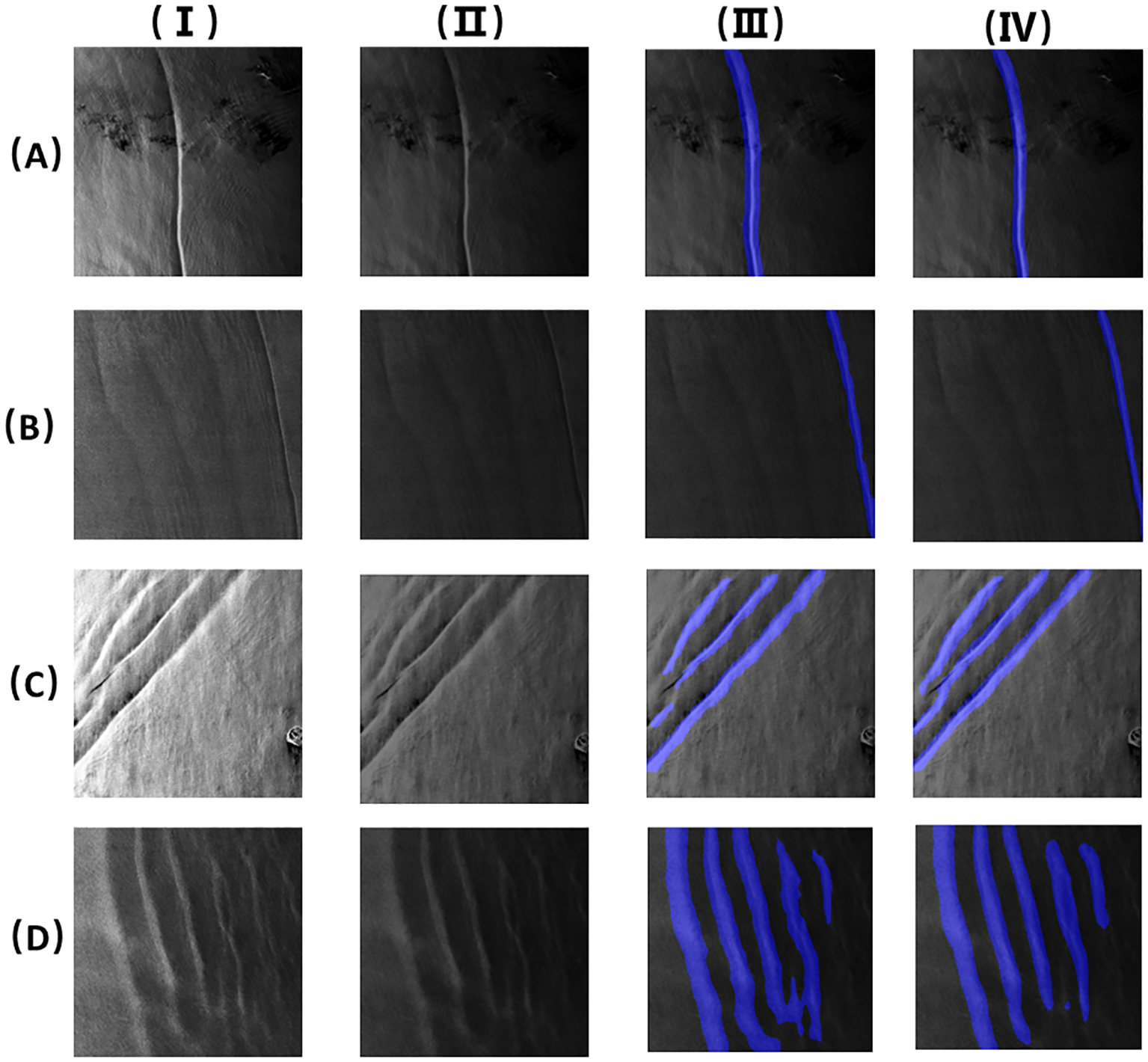 Oceanic internal waves appear as irregular streaks in SAR images, and this feature can easily be confused with features similar to other ocean phenomena. The amount of satellite remote sensing data is ever increasing; however, the traditional manual method of identifying the streaks of oceanic inland waves is error-prone and time-consuming. Therefore, to accurately determine the positions of oceanic internal waves, it is necessary to develop an automated segmentation method for oceanic internal waves in SAR images. Many scientists have studied the detection of oceanic internal waves. The detection and the feature description of oceanic internal waves in SAR images were realized based on wavelet transform (Rodenas and Garello, 1997). The two-dimensional wavelet transform was also used in a multi-scale gradient detection method to detect and locate oceanic internal waves (Ródenas and Garello, 1998). Li et al. (2020) used the optimized U-Net to obtain the stripes of oceanic internal waves from Himawari satellite images. A total of 120 of these images were randomly selected for training, and good results were achieved. Zhang et al. (2020) extracted 26 compact polarimetric (CP) features from fully polarimetric Advanced Land Observing Satellite-Phased Array-Type L-Band Synthetic Aperture Radar (ALOS-PALSAR) images to analyze the identification degree of internal waves using Jeffries and Euclidean distances and realized internal wave detection through the k-means clustering algorithm. Zheng et al. (2021c) classified SAR images and obtained oceanic internal waves based on support vector machine (SVM) and feature fusion. They then utilized Canny edges to detect the locations of the oceanic internal wave stripes. Moreover, Zheng et al. (2021b) proposed a segmentation algorithm for oceanic internal wave stripes in SAR images based on SegNet, which can be used to obtain the positions of the stripes and the relative positions of the light and dark stripes. Most recently, Zhang et al. (2024b) introduced a new SAR polarization measurement method that can detect man-made objects and ocean ice and indicate the motion of ship targets and ocean currents.
