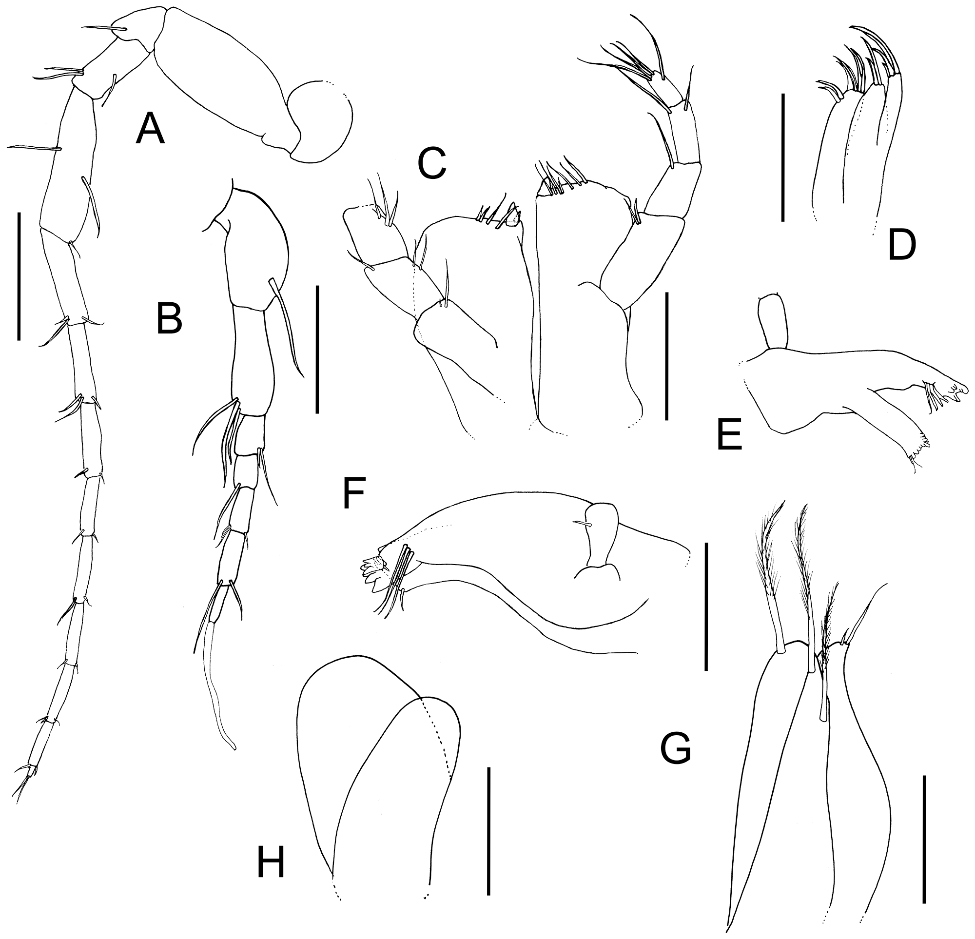 Pentaceration forkandbrewer sp. nov., holotype, female, NIWA 173287, 1.0 mm, Otago, New Zealand. (A) Antenna. (B) Antennula. (C) Maxillipeds, ventral view. (D) Left Maxillula. (E) Left mandible. (F) Right mandible. (G) Pleopod 3. (H) Pleopod 5. Scales represent 0.1 mm.