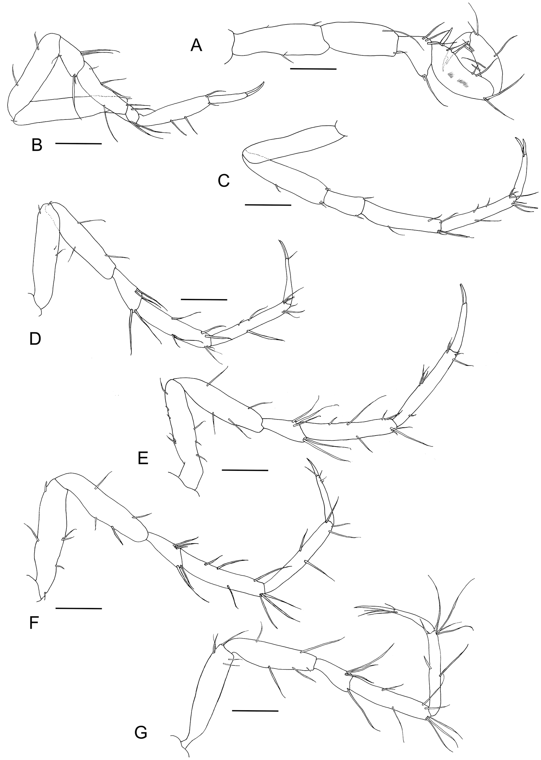 Pentaceration forkandbrewer sp. nov., holotype, female, NIWA 173287, 1.0 mm, Otago, New Zealand. (A) Pereopod I. (B) Pereopod II. (C) Pereopod III. (D) Pereopod IV. (E) Pereopod V. (F) Pereopod VI. (G) Pereopod VII. Scales represent 0.1 mm.