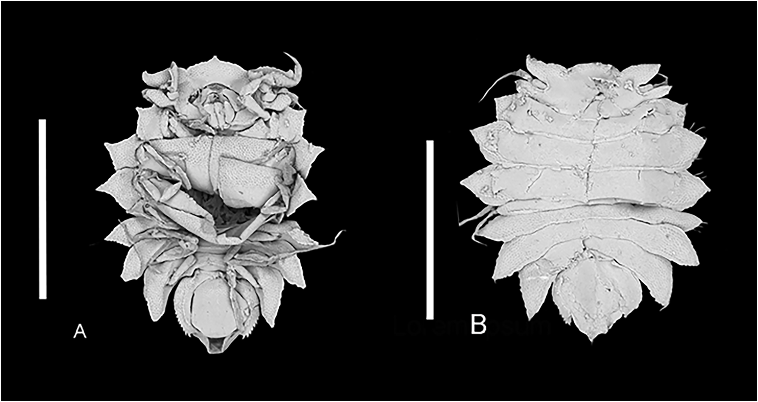 Pentacertion forkandbrewer sp. nov. (A) Paratype, female, NIWA 173289, 1.5 mm. Otago. Ventral view (SEM). (B) Paratype, male, NIWA 173289, 1.5 mm, dorsal view (SEM). Scales represent 1.0 mm.