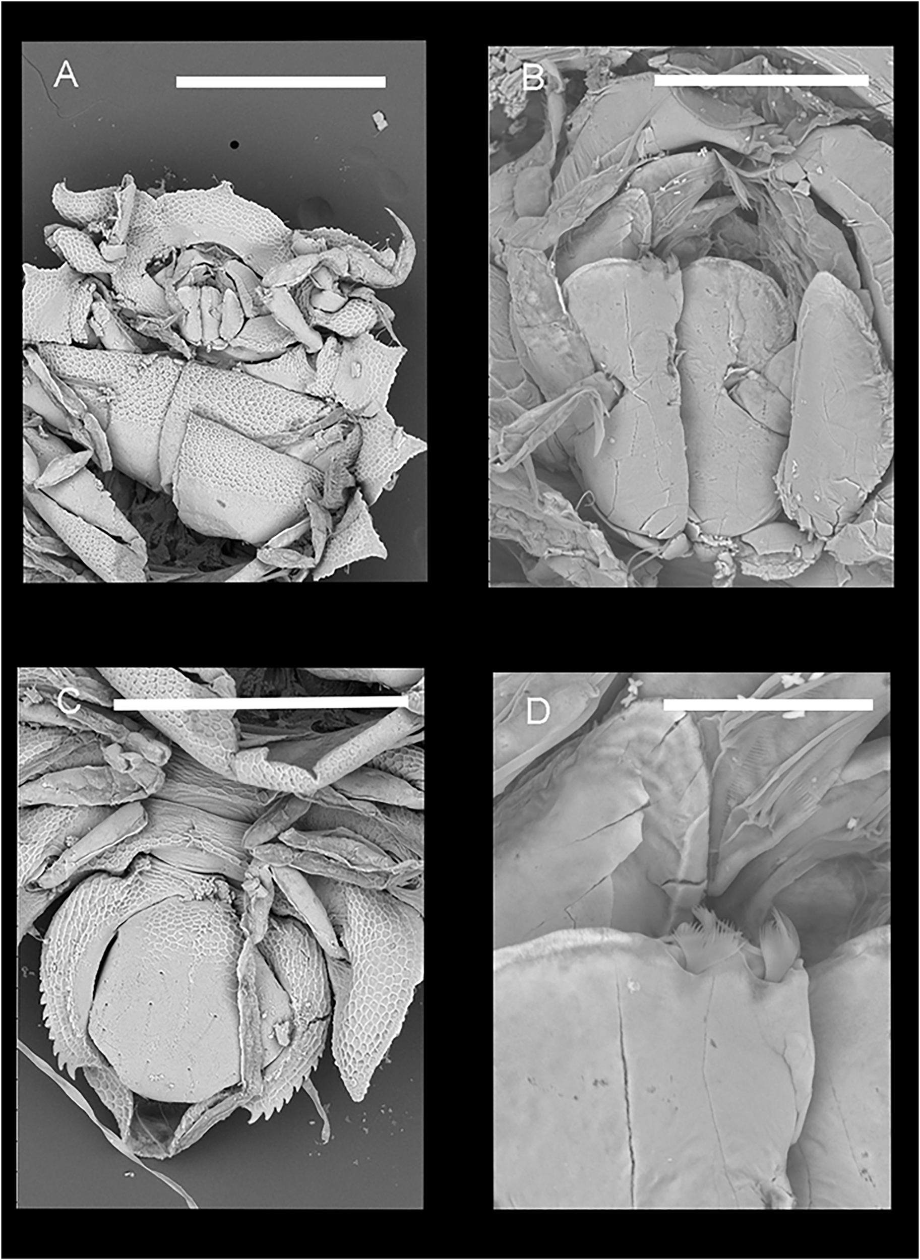 Pentaceration forkandbrewer sp. nov. (A) Paratype, female, NIWA173289, head and anterior body, ventral view (SEM). Scale represents 0.5 mm. (B) Paratype, female, NIWA173289, ventral close-up of maxilliped (SEM). Scale represents 0.1 mm. (C) Paratype, female, NIWA173289, pleotelson (SEM). Scale represents 0.5 mm. (D) Paratype, female, NIWA173289, close-up of feathered setae on the maxilliped (SEM). Scale represents 0.03 mm.