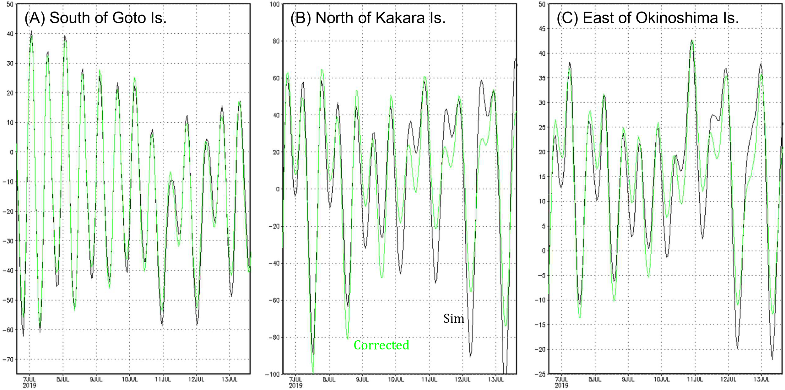 Finally, by correcting the tidal and empirical parameters in the DR_D model using the numerical Green’s function as in previous section and Hirose et al. (2021), and assimilating fishing vessel data (ADCP, S-CTD) into this model with the approximate Kalman filter, significant improvements were found particularly in the velocity changes (Figure 5).