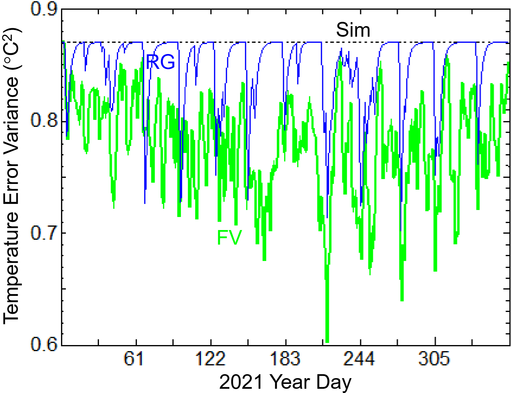 Time series of diagonal average of temperature part of error covariance matrices for the three cases of no-data assimilation (Sim, black dots), data assimilation with regular governmental measurement (RG, blue curve) and irregular fishing vessel measurement (FV, green curve).