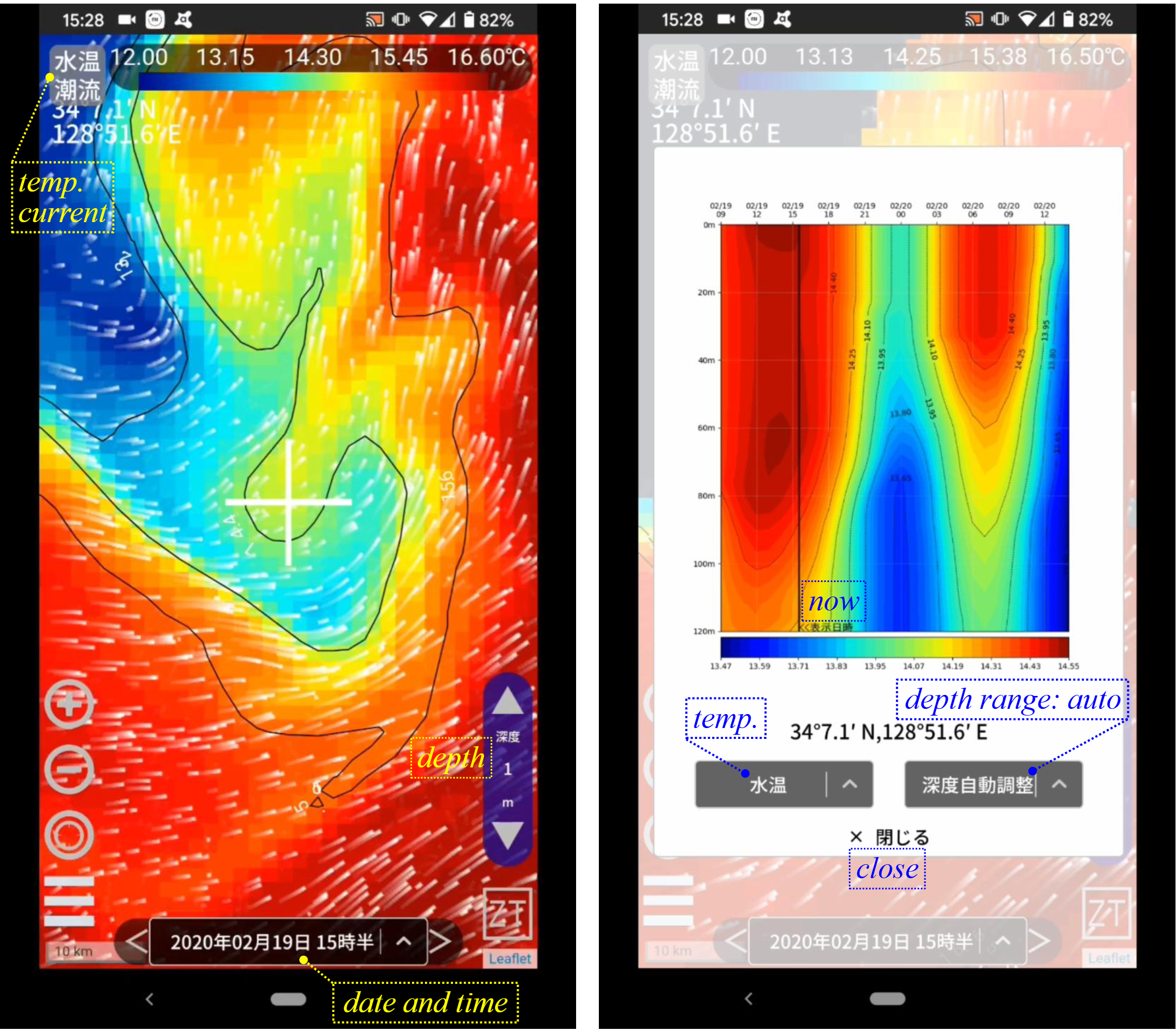 Screen shots of prediction app “Yochou” for (left) horizontal map and (right) depth-time diagram. Translations are shown in italics.