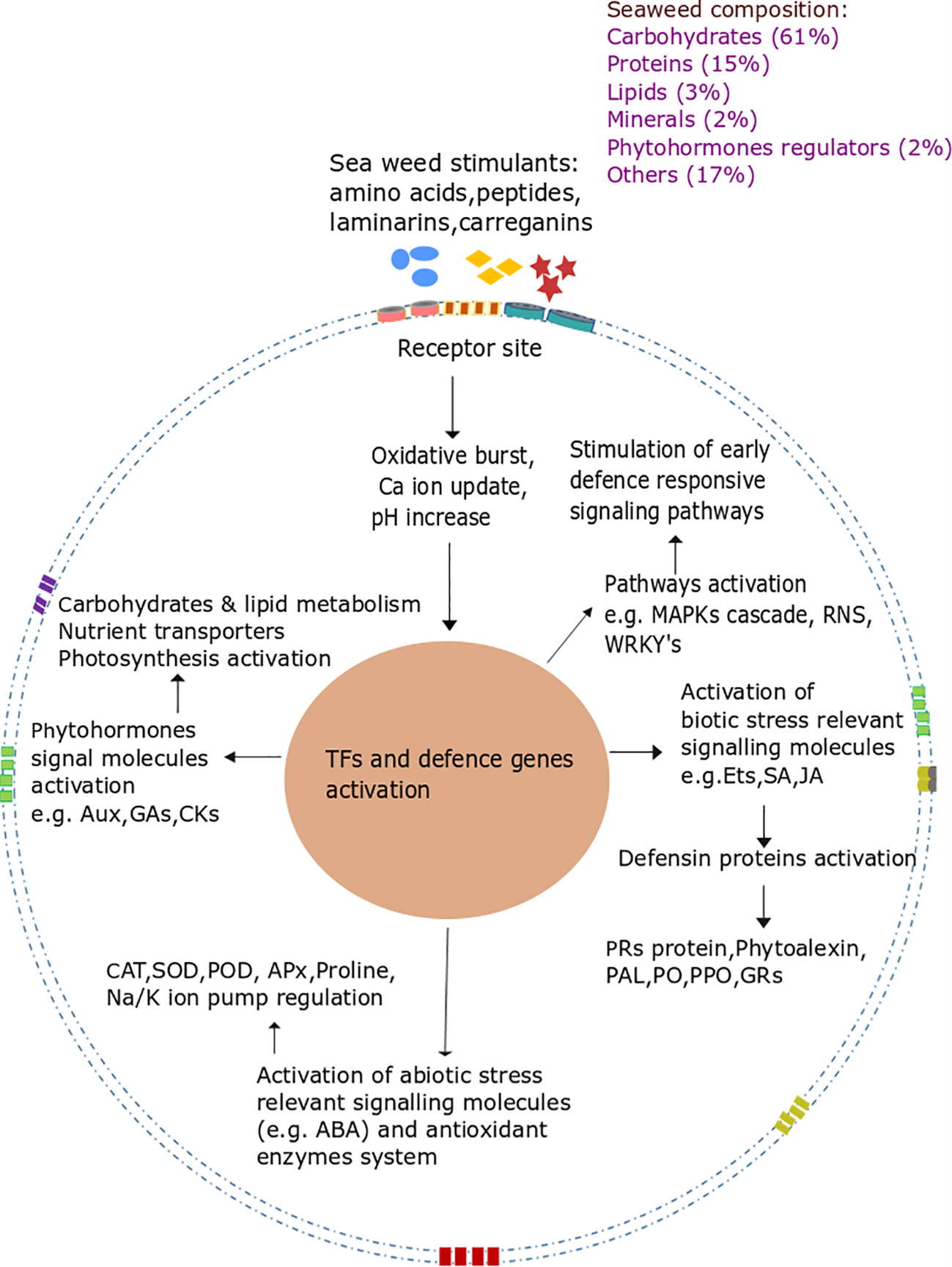 Seaweed extract used as an elicitor to enhance plant defense mechanisms. The figure illustrates how seaweed-derived biostimulants, which are rich in carbohydrates, proteins, lipids, minerals, phytohormone regulators, and other compounds, enhance plant stress tolerance by activating various defense mechanisms. These stimulants bind to receptor sites on the plant cell membrane, triggering an oxidative burst, calcium ion uptake, and pH changes, which initiate early defense signaling pathways. This leads to the activation of defense genes through transcription factors like WRKYs, stimulating defense pathways such as MAPK cascades and producing key molecules involved in biotic stress resistance, including ethylene (Ets), salicylic acid (SA), and jasmonic acid (JA). As a result, defensive proteins such as defensins and pathogenesis-related (PR) proteins are activated, along with key antioxidant enzymes like phenylalanine ammonia-lyase (PAL), peroxidase (PO), polyphenol oxidase (PPO), and glutathione reductase (GR). Additionally, seaweed stimulants activate abiotic stress response pathways, enhancing the activity of phytohormones like auxins (Aux), gibberellins (GA), cytokinins (CK), and abscisic acid (ABA), as well as antioxidant enzymes such as catalase (CAT), superoxide dismutase (SOD), and peroxidase (POD), which help mitigate oxidative stress. This includes the regulation of osmoprotectants like proline and ion pumps that maintain homeostasis under stressful conditions. Furthermore, seaweed stimulants enhance carbohydrate and lipid metabolism, nutrient uptake, and photosynthesis, which provide the energy and resources required for maintaining plant health and resilience, ultimately improving crop tolerance to both biotic and abiotic stresses, making seaweed biostimulants valuable tools for sustainable agriculture.
