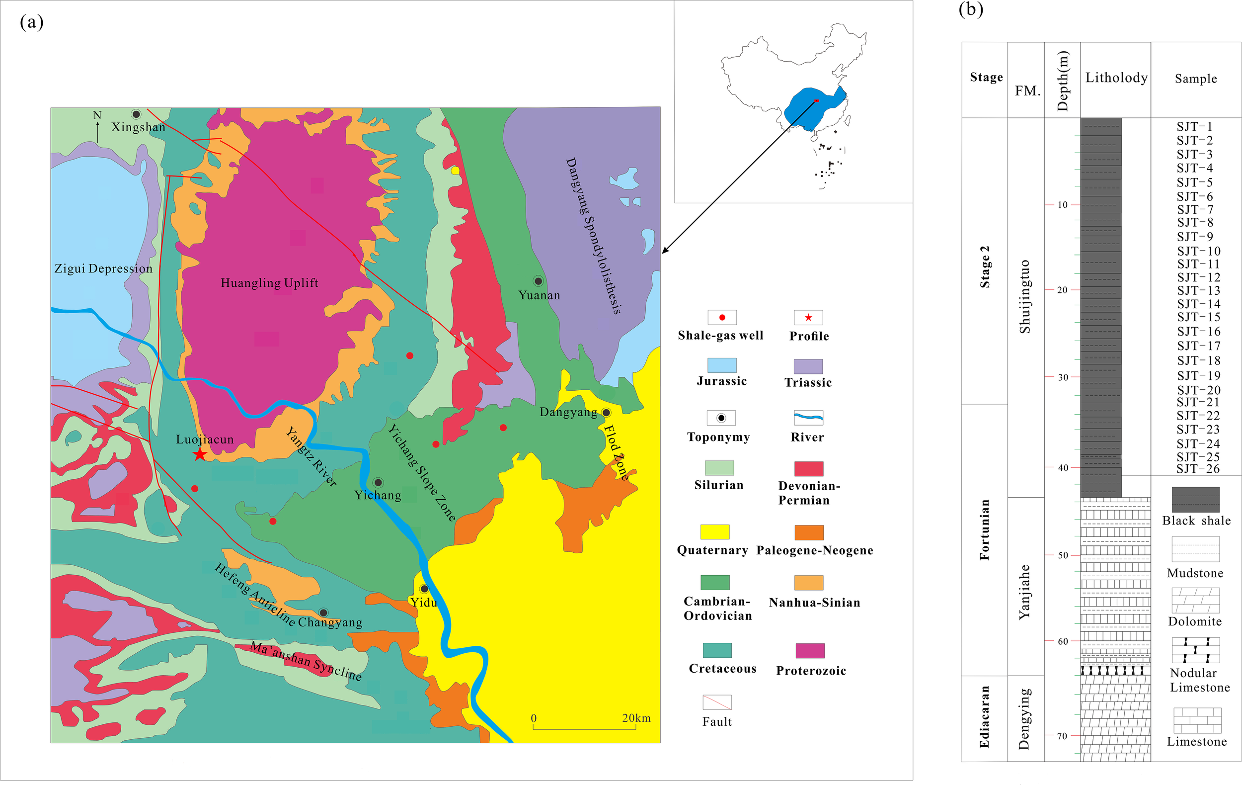 (A) Regional geological map of the study area (modified from Chen, 2018); (B) sampling column of the Shuingtuo Formation.