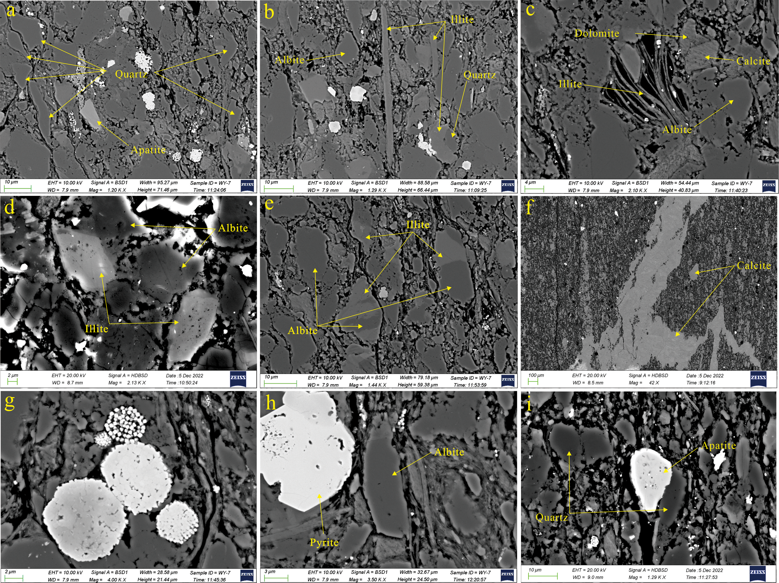 Modes of occurrence of minerals in the Shuiijingtuo black shale. (A) clastic quartz and apatite in sample No.7; (B) authigenic quartz, albite and illite in sample No.7; (C) illite, albite, calcite and dolomite in sample No.7; (D) authigenic illite and albite in sample No.9; (E) Mutually metasomatized illite and albite in sample No.7; (F) calcite vein in sample No.21; (G) framboidal pyrite in sample No.9; (H) single subhedral crystals pyrite and albite in sample No.7; (I) authigenic quartz, albite and apatite in sample No.7.