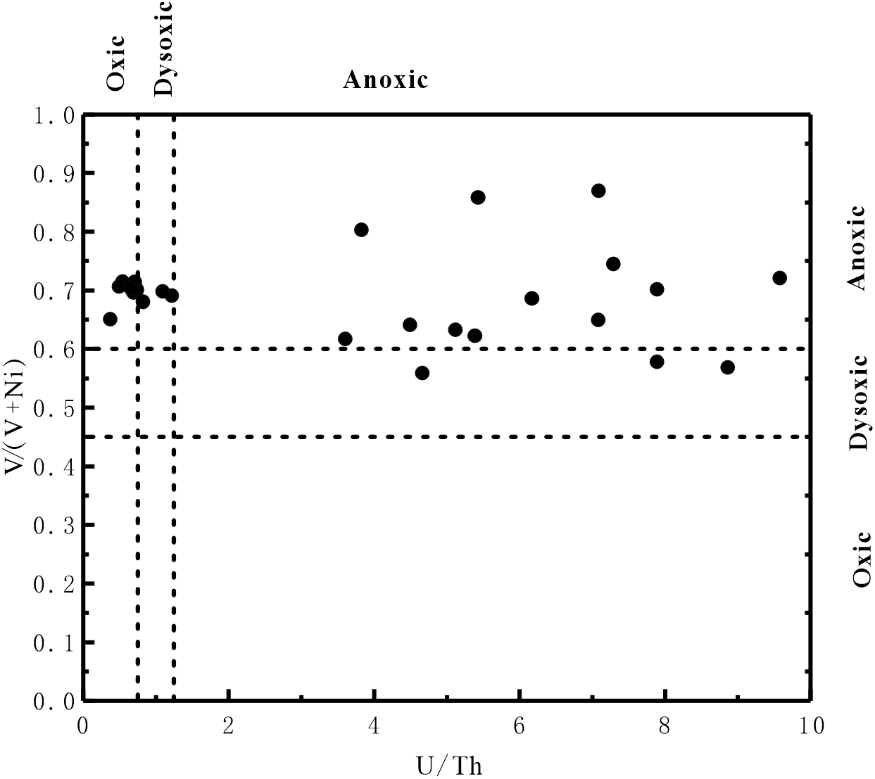 Prior to ICP-MS determination, each black shale sample was acid-digested according to the following process: Dry the samples at 105°C for 12 hours. 50 mg of each sample was digested with 1 ml HNO3 and 1 ml HF, and heated at 190°C for more than 24 hours. Cool the digestion solution down, and evaporate it at 140°C on an electric heating plate until dry, then digest the residue with 1 ml HNO3 and evaporate it to dry again. Thereafter, the residue was digested with1 ml HNO3, 1 ml MQ water and 1 ml of internal standard In (the concentration is 1 μg/g) and heated at 190°C for more than 12 hours. Subsequently, the solution was diluted with 2% HNO3 for ICP-MS determination. Multi-element standard sample (BHVO-2、BCR-2 and RGM-2) was used for calibration of trace element concentrations. Precision for determination of trace element concentrations is better than 5.0%.