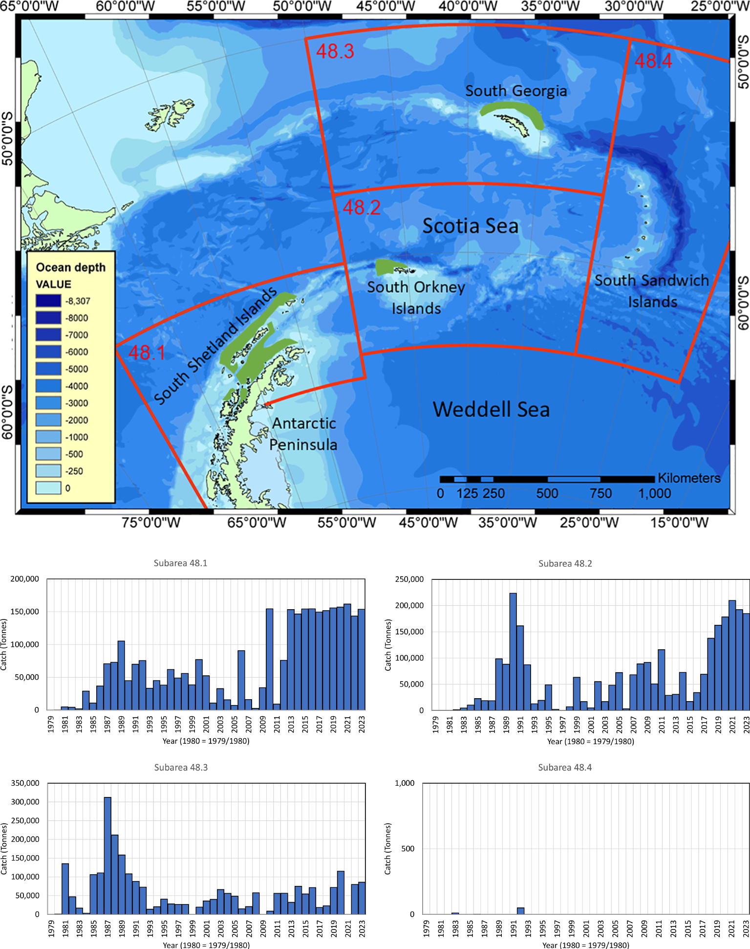 Currently, it is not operationally feasible to undertake large-scale acoustic surveys every year; however, annual small-scale surveys provide confidence about the continuing status of the krill stock (e.g. Reiss et al., 2008; Skaret et al., 2023; Fielding et al., 2014; Trathan et al., 2022a). Variability is known to exist in krill distribution and abundance, plausibly driven by physical forcing factors (Trathan and Murphy, 2003; Murphy et al., 2004; Trathan et al., 2022a). Approximately 87% of the circumpolar krill stock occurs offshore over waters >2000 m deep (Atkinson et al., 2008), although the fishery primarily operates over shelf and shelf slope areas (Figure 1) where krill density is much higher. Most catches are taken around the Antarctic Peninsula (Subarea 48.1), to the west of the South Orkney Islands (Subarea 48.2) and in waters adjacent to South Georgia (Subarea 48.3). Catches at the South Sandwich Islands (Subarea 48.4) have been negligible since CCAMLR was agreed in 1980 (Figure 1). Pressure to increase catches in Subarea 48.1 continues to drive the development of CCAMLR’s krill fishery management procedures. However, the expiration of CM 51-07 (CCAMLR, 2023b) might now lead to unintended consequences if increased catches repeatedly aggregate in space and time, particularly before a revised management framework is ready.