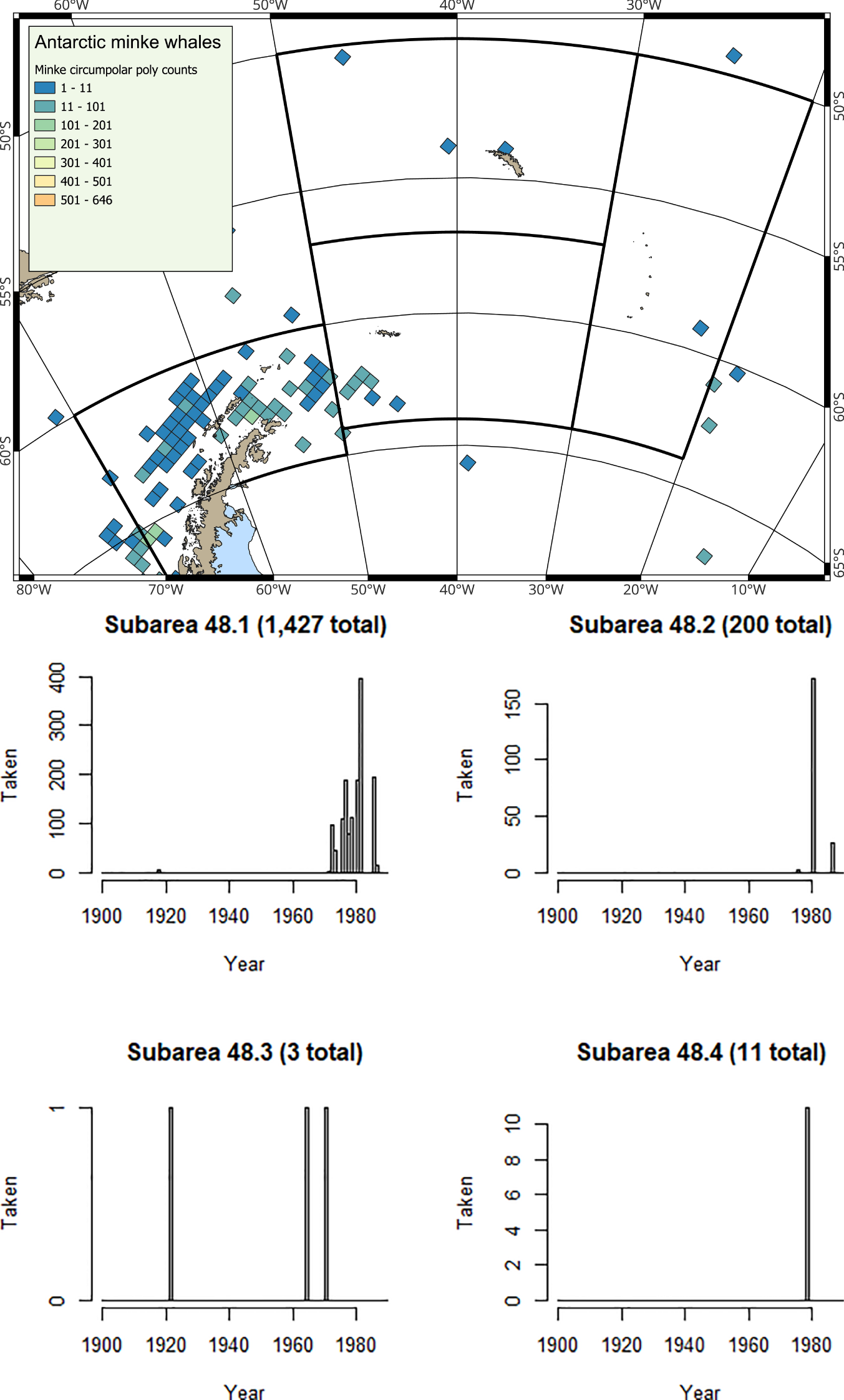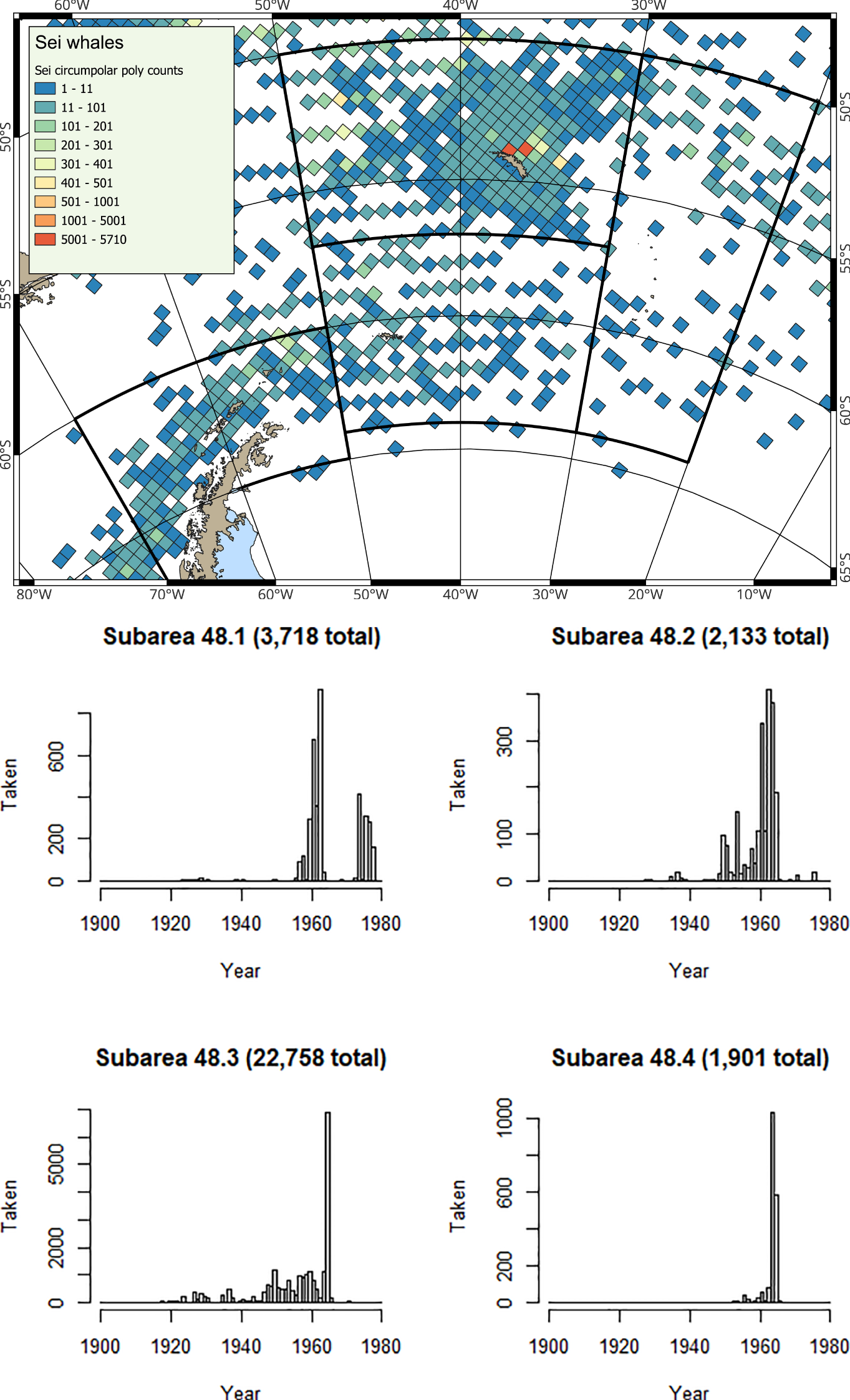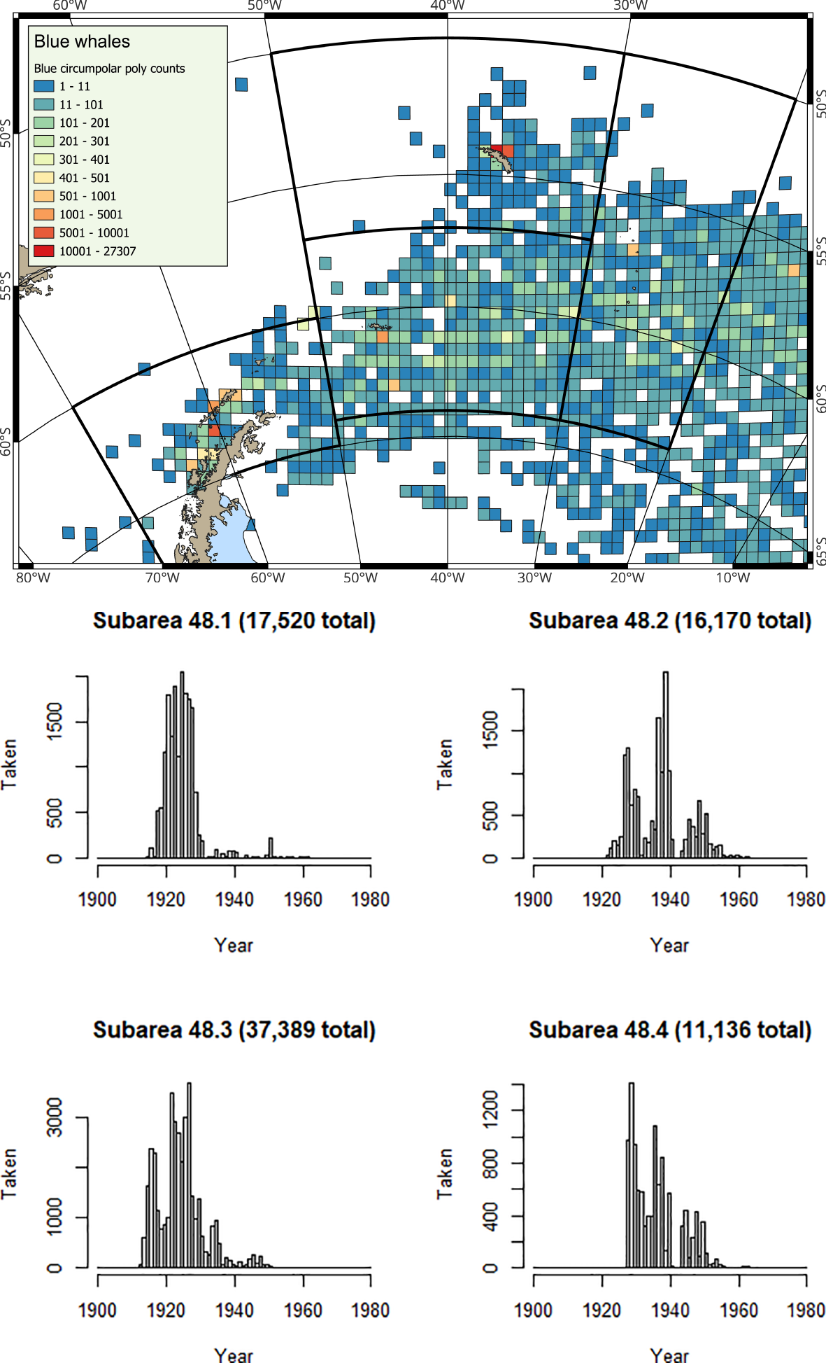 (Map) Spatial and (Histograms) Temporal distribution of historical catches for Antarctic blue whales from Allison (2016); note y-axes differ in the histograms.