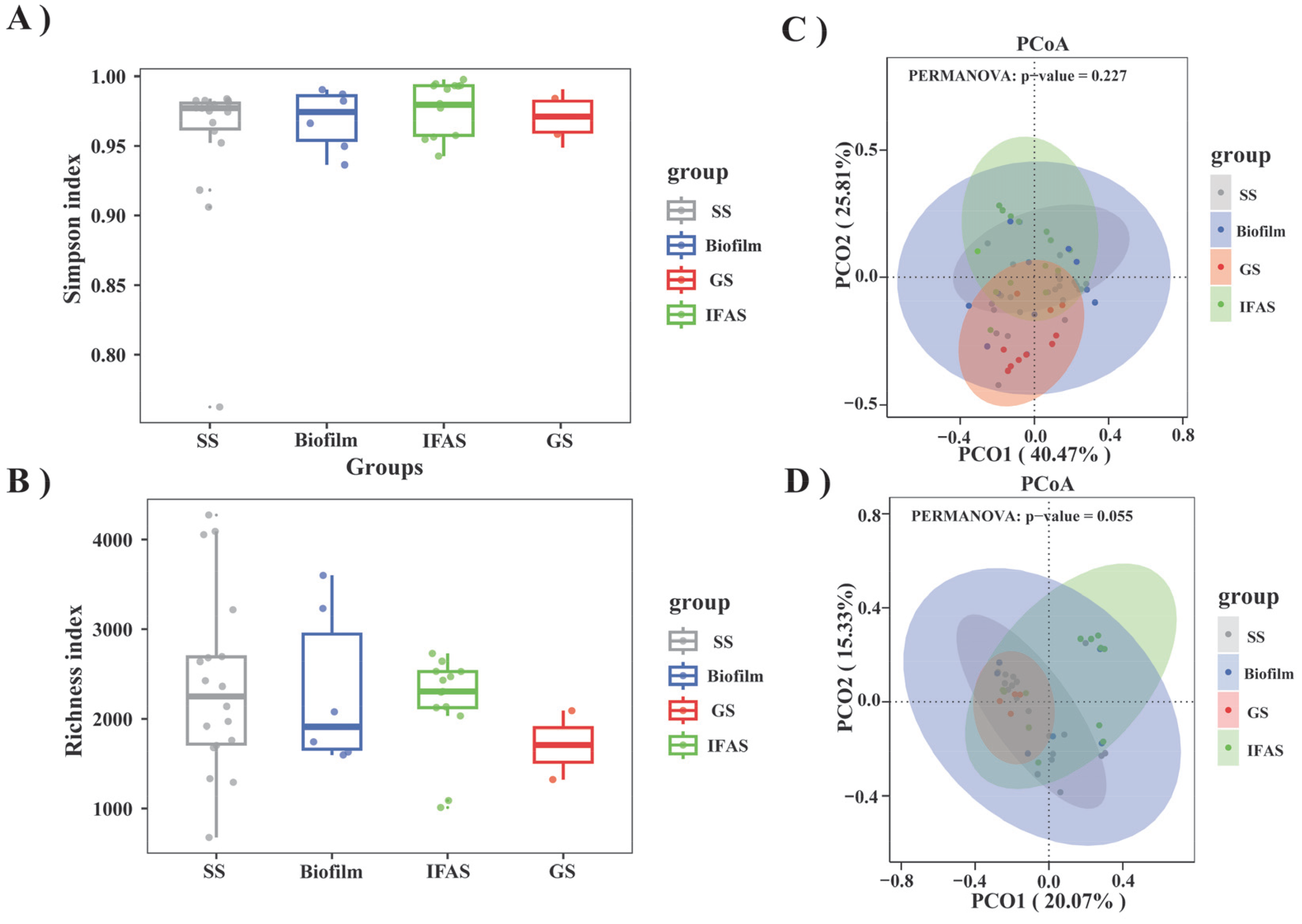 The richness index provided a more intuitive representation of biodiversity across the four microbial morphologies (Figure 2B). The presence of outliers in all groups indicated occasional significant deviations in species richness. Notably, the richness index distribution in the SS and biofilm groups showed a wide range, reflecting substantial variability in species abundance. In contrast, the IFAS group exhibited a higher and more stable richness index, indicating uniform numbers of species. The GS group exhibited the lowest richness index among the morphologies, with minimal variation, consistent with the results of the Simpson analysis.