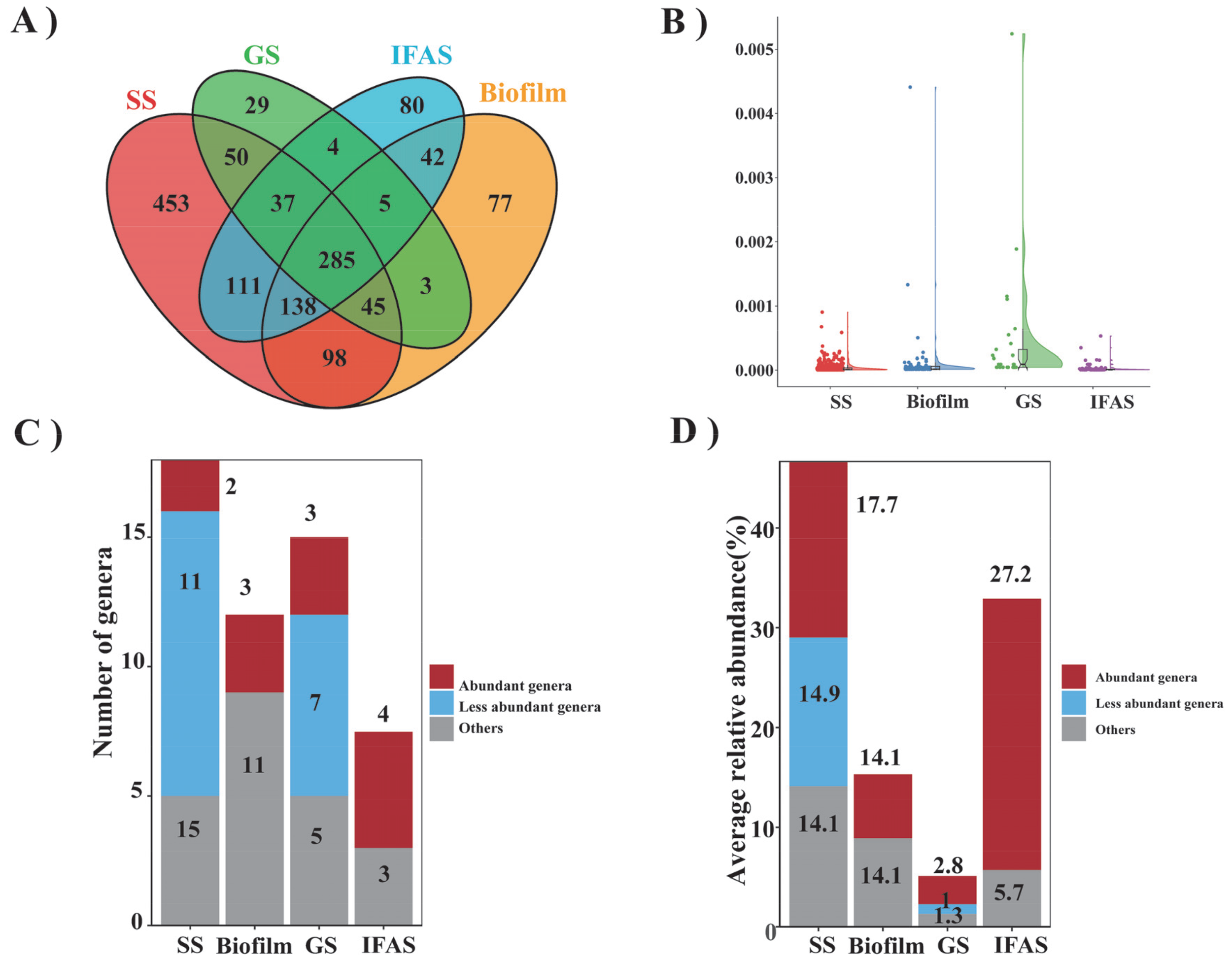 A comprehensive examination revealed a total of 1217, 693, 458, and 702 genera in SS, biofilm, GS, and IFAS samples, respectively (Figure 3A). Among them, SS had the highest number of unique bacterial genera at 453, while GS had the lowest at 29. The unique bacterial genera in biofilm and IFAS were 77 and 80, respectively. Additionally, 285 genera were identified in the overlapping central regions across all microbial morphologies, indicating their ubiquity within these systems. Conversely, fewer genera were shared between specific groups, highlighting the distinctiveness of microbial compositions in each morphology.
