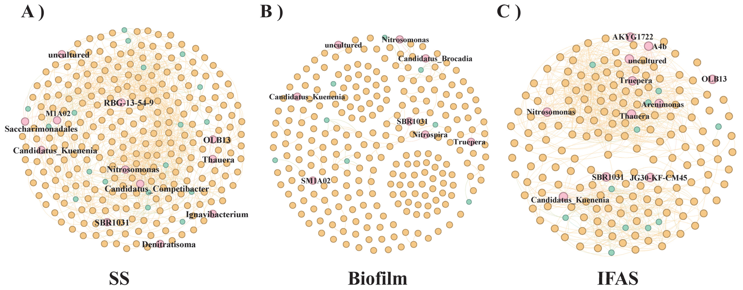 Co-occurrence analysis of frequently observed genus across different microbial morphologies. Each node represents a genus, with node size proportional to its degree and color indicating frequency of occurrence [(A) SS, (B) Biofilm, (C) IFAS].
