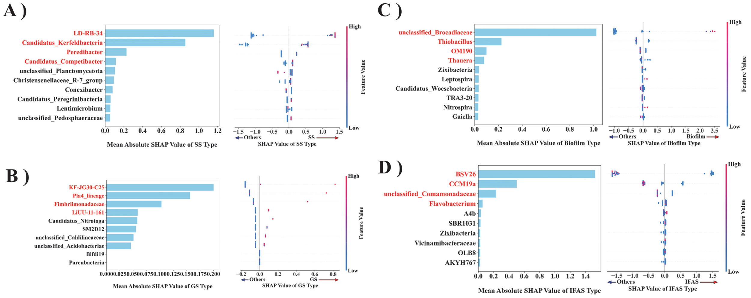 The importance of the microbial flora in predictive decision-making is ranked based on their characteristics. The XGBoost model was employed to estimate the mean absolute SHAP values for each bacterial population [(A) SS, (B) GS, (C) Biofilm, (D) IFAS] and to generate the corresponding SAP value dot plots.