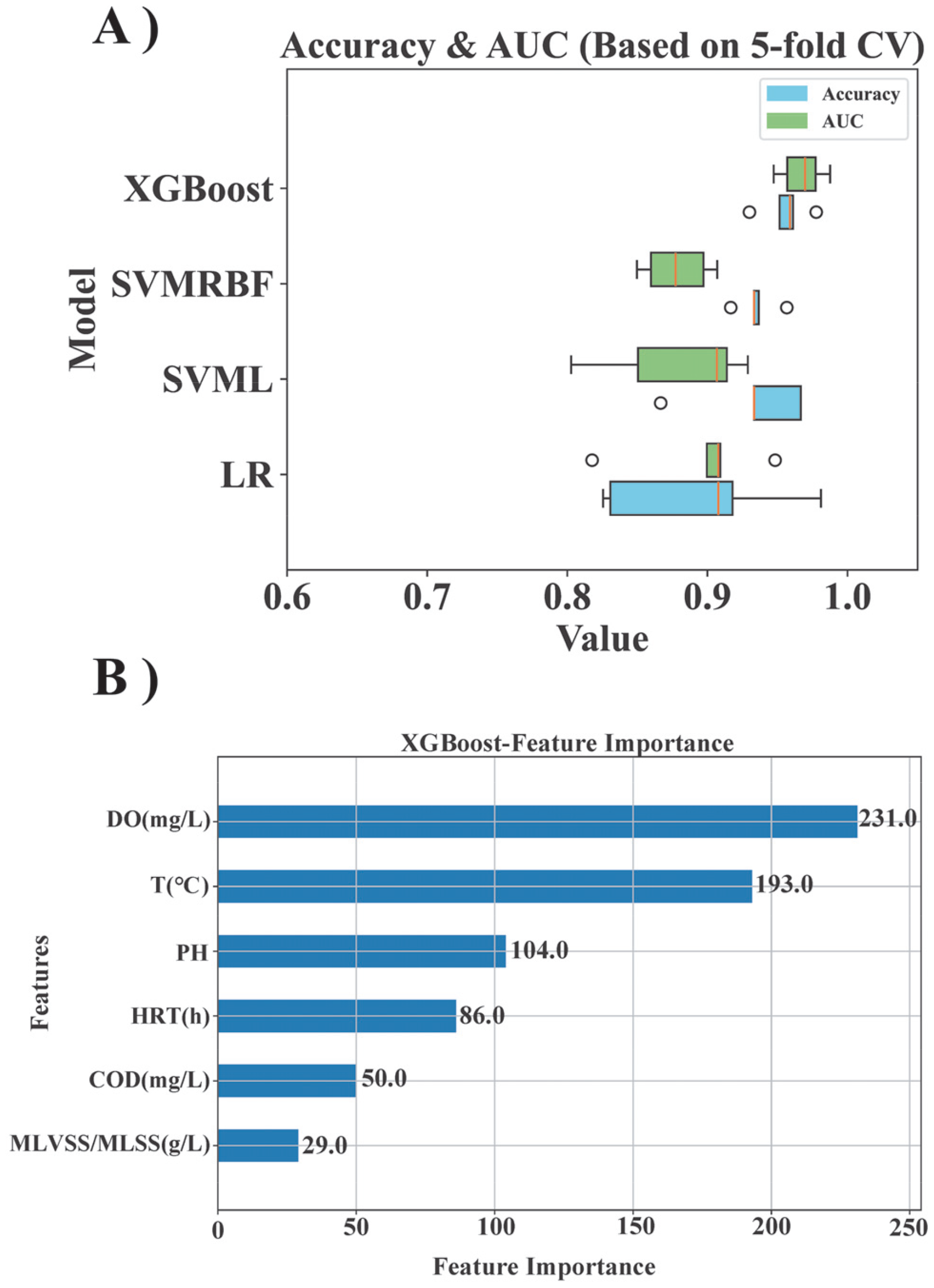 The performance of ML modeling utilizes environmental condition data to determine the significance of each feature. (A) Classification prediction accuracy and AUC of four ML models. (B) Estimation of the mean absolute SHAP value for each environmental factor using the XGBoost model.
