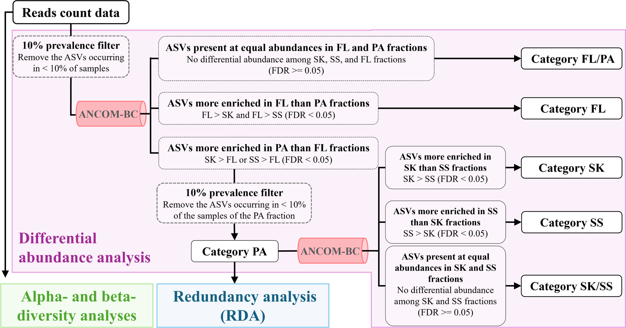To investigate the enrichment pattern of bacterial taxa in the three microhabitat fractions (SK, SS, and FL fractions), differential abundance analysis was performed using ANCOM-BC [(Lin and Peddada, 2020); https://github.com/FrederickHuangLin/ANCOM-BC] after prevalence filtering to remove ASVs that occurred in < 10% of the samples (Faust, 2021). A two-step procedure was used to divide bacterial ASVs into microhabitat categories based on their enrichment patterns (Figure 1). In the first step, the ASVs were divided into Category FL (ASVs more enriched in the FL than the particle [PA; including SK and SS] fractions), Category PA (ASVs more enriched in the PA than the FL fraction and present in > 10% of the samples of the PA fraction), and Category FL/PA (ASVs present in equal abundances in the PA and FL fractions). In the second step, the ASVs of Category PA were divided into Category SK (ASVs more enriched in the SK than the SS fraction), Category SS (ASVs more enriched in the SS than the SK fraction), and Category SK/SS (ASVs present in equal abundances in the SK and SS fractions). The significance of enrichment was evaluated by calculating the log fold change, based on the p-value adjusted for the false discovery rate using the Benjamini–Hochberg procedure [false discovery rate (FDR) < 0.05; FDR, adjusted p-value].