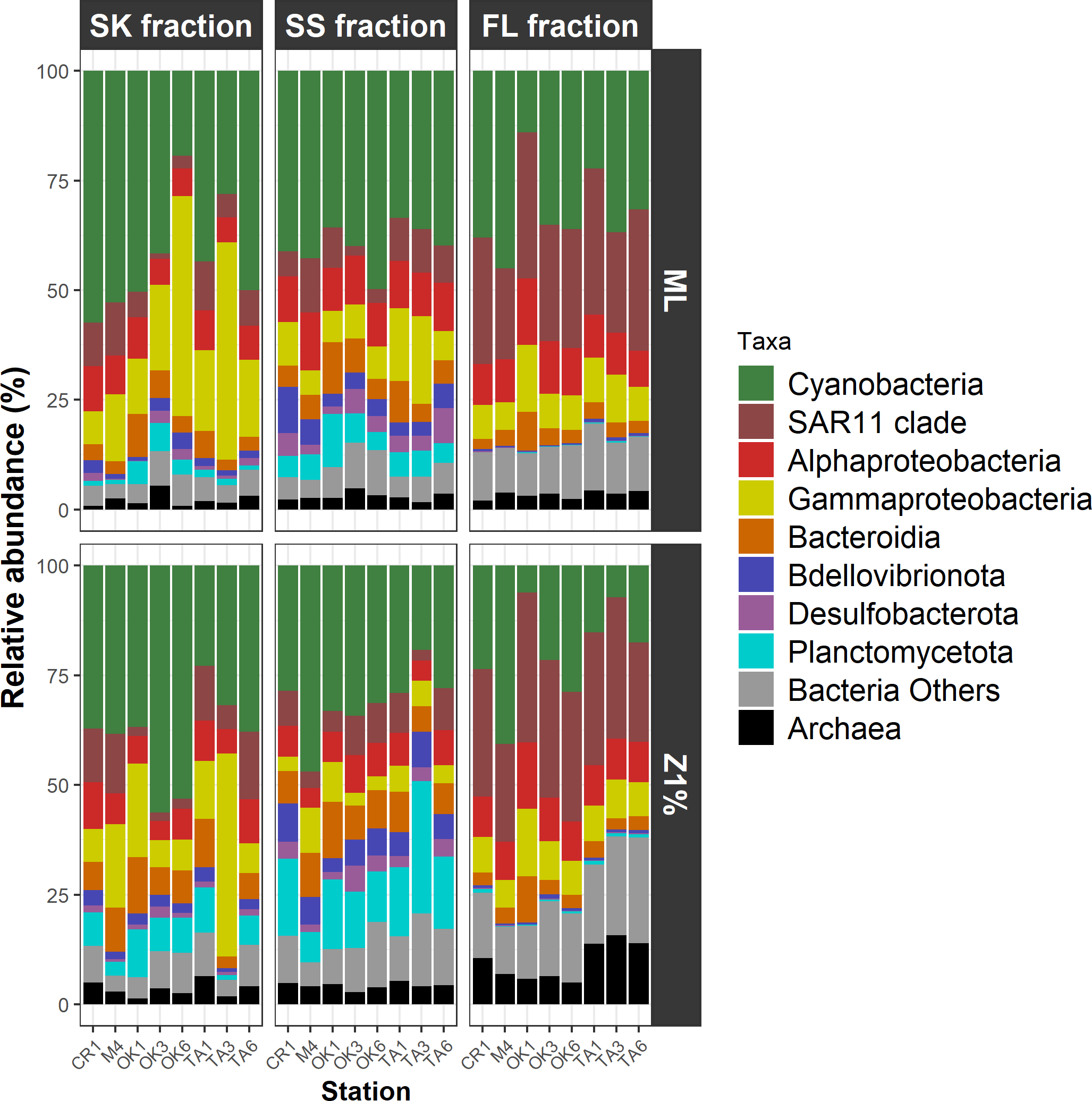 Alphaproteobacteria and Cyanobacteria were the most abundant taxa, together accounting for 26.2–77.6% of the total reads irrespective of the fraction (Figure 2; Supplementary Table S5). Approximately half of alphaproteobacterial reads were affiliated with the SAR11 clade (Figure 2; Supplementary Table S5). Prochlorococcus accounted for most of the Cyanobacteria (Supplementary Table S6). Other abundant taxa (mean relative abundance > 5% in at least one of the three fractions) were Gammaproteobacteria, Bacteroidia, and Planctomycetota (Figure 2; Supplementary Table S5). These taxa tended to be more abundant in the particle (SK and SS) fractions than in the FL fraction (Figure 2).