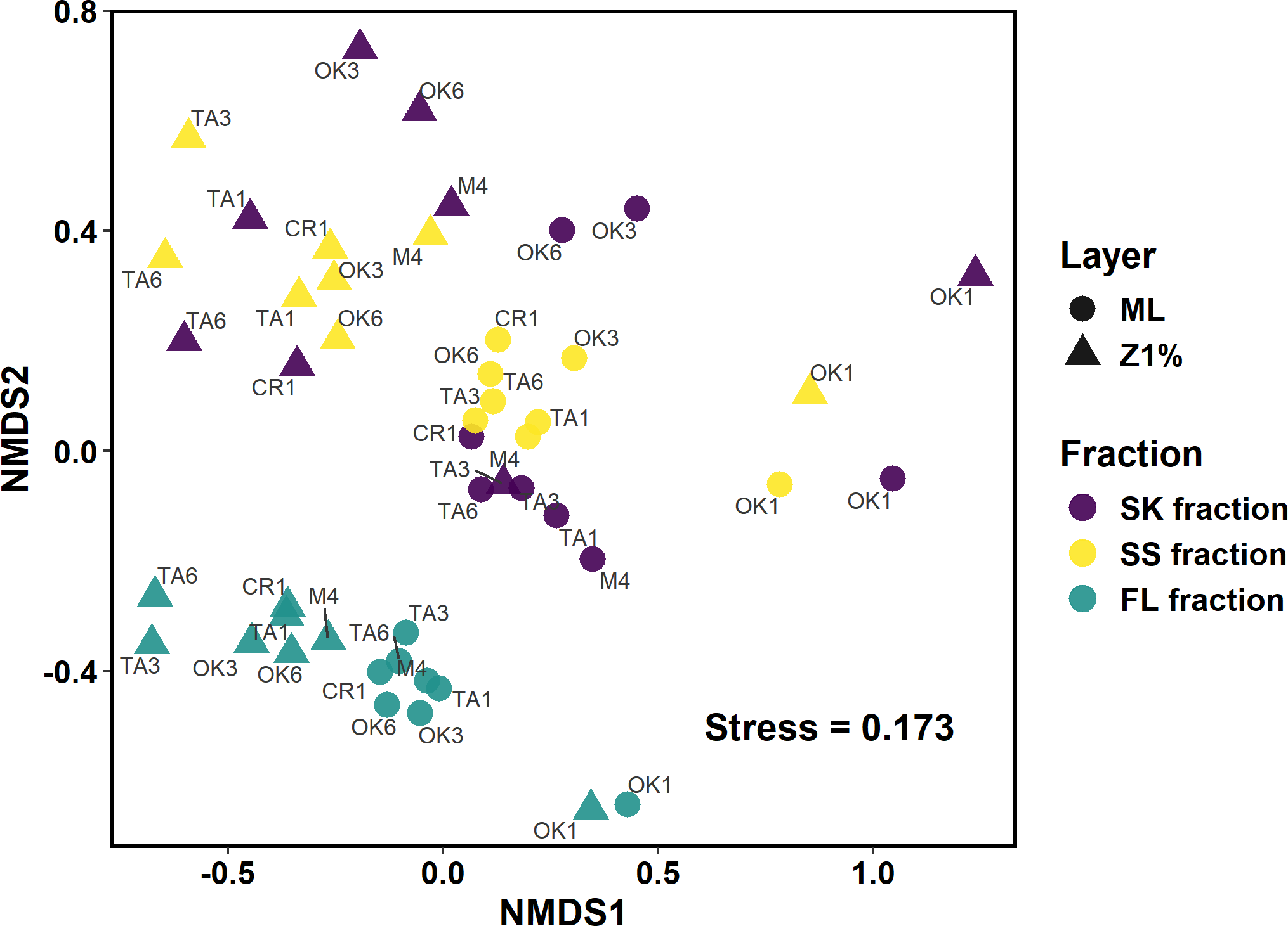 Non-metric multidimensional scaling ordinations representing the Bray–Curtis dissimilarities among samples. Symbol color and shape indicate the sampling fractions and layers, respectively. Names of sampling stations are shown. FL, free-living fraction; SK, sinking particle fraction; SS, suspended-particle fraction. ML, mixed layer; Z1%, layer at which PAR is 1% of the sea-surface value.