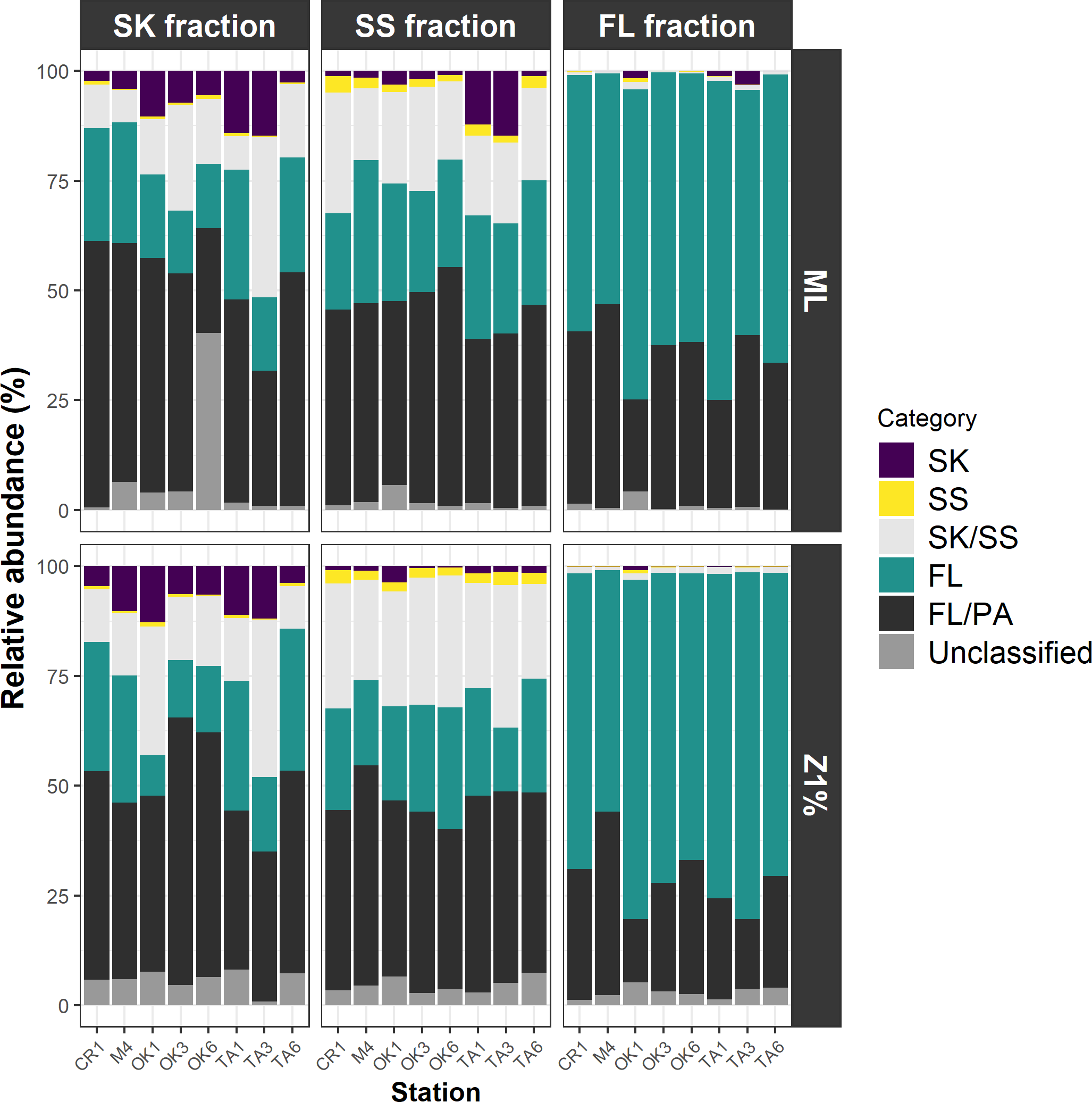 Contributions of the communities in each microhabitat category. Those labeled unclassified are amplicon sequence variants for which differential abundance analysis was not performed because of their infrequency. FL, free-living fraction; SK, sinking-particle fraction; SS, suspended-particle fraction. ML, mixed layer; Z1%, layer at which PAR is 1% of the sea-surface value.