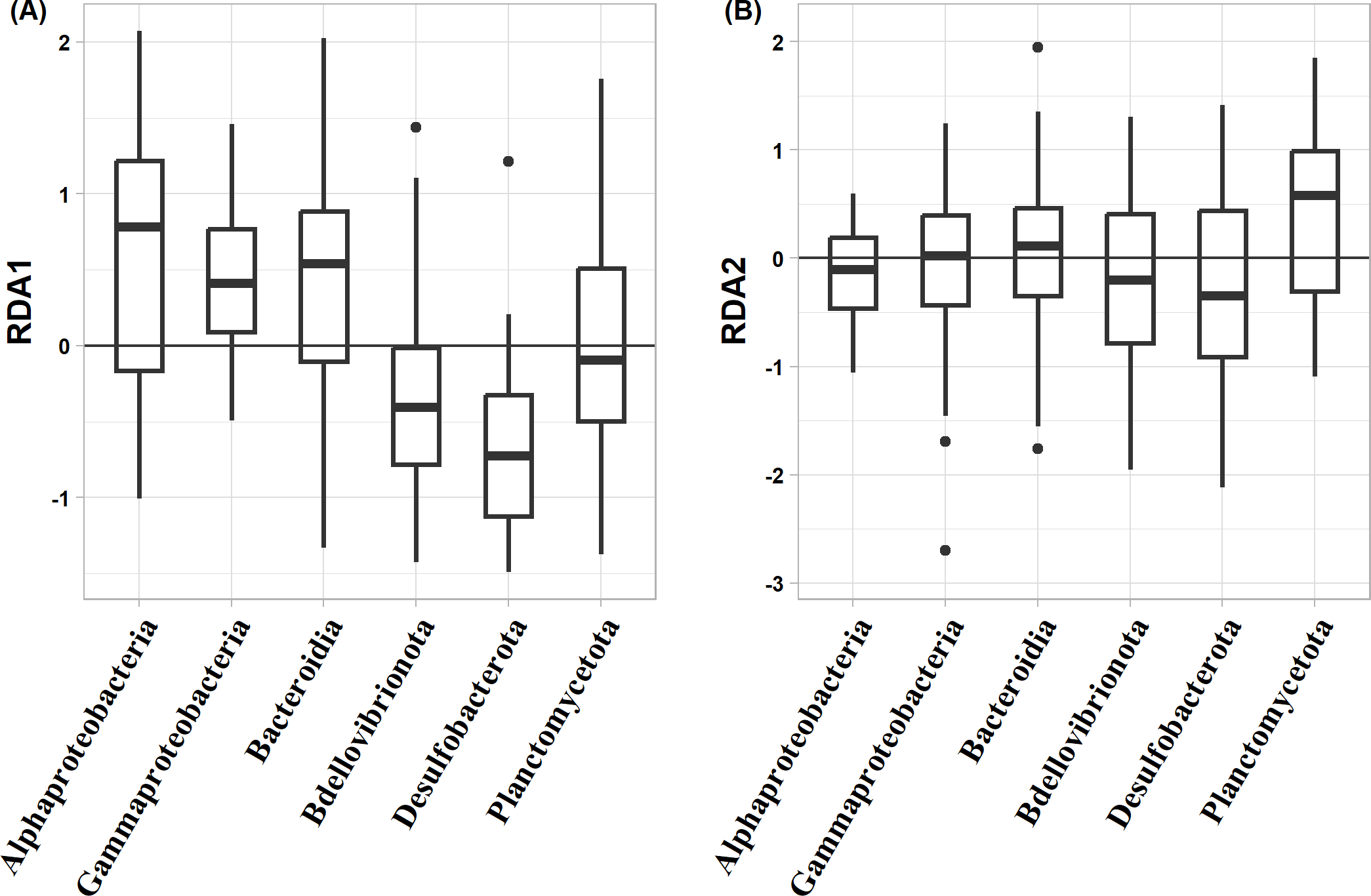 To investigate the relationships among particle-associated bacterial community composition (Category PA), environmental variables, and particle biochemical properties, RDA combined with compositional data analysis was performed to circumvent the problem of spurious correlations resulting from a constant-sum constraint of the relative-abundance data (Gloor et al., 2017). Zeros in the relative-abundance data of the Category PA community in the SK and SS fractions were replaced by the multiplicative simple replacement algorithm, which preserves the relative multivariate structure of the data using the “multRep” function in R package “ZCompositions” (Palarea-Albaladejo and Martín-Fernández, 2015). Subsequently, the data were centered-log-ratio (CLR) transformed (Aitchison, 1983; Gloor et al., 2017) using the “clr” function in R package “compositions” (van den Boogaart and Tolosana-Delgado, 2008). The RDA was performed using “rda” functions in R package “vegan” (Oksanen et al., 2022) with the CLR-transformed Category PA data as a response variable and the environmental variables as the explanatory variables. The environmental variables were centered and standardized using the “decostand” function. Collinearity was avoided by removing a highly correlated explanatory variable (|r| > 0.8 and FDR < 0.05, where r is Pearson’s correlation coefficient and FDR is the p-value adjusted using the Benjamini–Hochberg procedure). Important explanatory variables were selected using the “rda” and the “ordiR2step” functions in R package “vegan” (Oksanen et al., 2022). The distributions of ASVs and samples on the RDA ordinations were represented by type I-scaled RDA scores, which reflected their distances. The correlations of explanatory variables with the RDA axes were represented by correlation-scaled RDA scores (type II scaling). To examine differences in bacterial distribution across microhabitat categories along the RDA ordinations, t-tests were performed using JMP Pro (MA, USA). To investigate the distribution patterns of taxa along the RDA ordinations, the one-sample Wilcoxon signed-rank test was performed using JMP Pro (MA, USA).