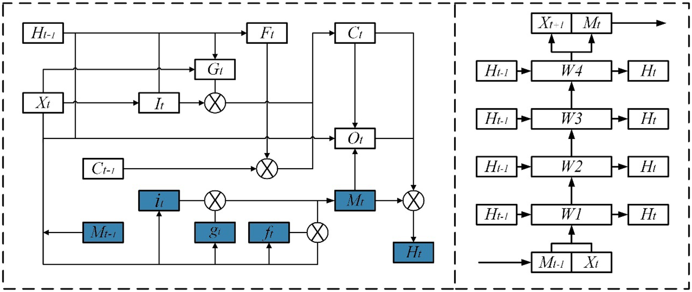 where σ is the activation function, W corresponds to the process weight of the corner scale, b is the bias term (distinguished by the corner scale), X is the input sequence, C is the output cell, and H is the hidden state. The most important feature of the ST-LSTM model is that the memory cell is divided into two parts, namely, the classical Ct temporal cell and the Mt spatio-temporal cell, and they are distinguished in the level of the data flow. The Ct stream is passed continuously between the same corresponding layers of different stacks according to the classical Conv-LSTM. The Mt stream is first passed layer by layer in the same stack, repeated as the input of the next stack, and finally reduced to the same dimension by a 1×1 convolutional gate and outputted as Ht. This is different from the spatiotemporal memory transfer method of the classical Conv-LSTM to a large extent.