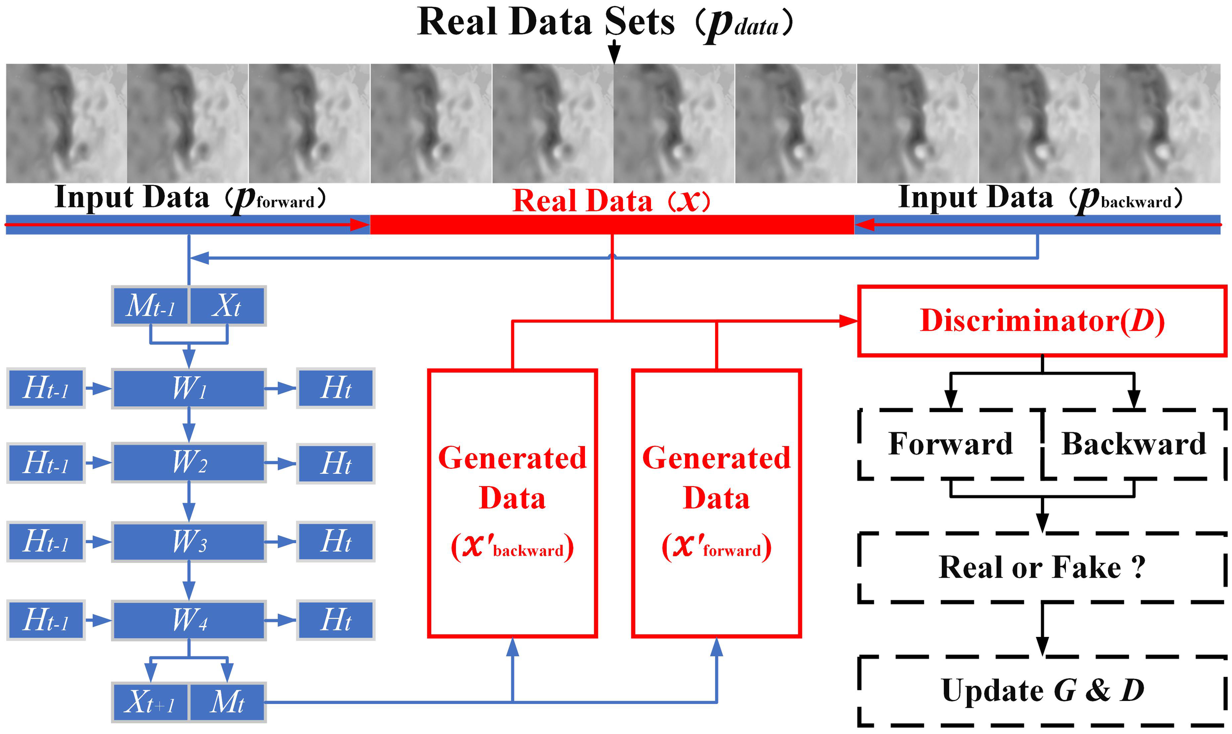In this paper, we use a total of 10,000 days of sea surface altimetry data from 1 January 1993 to 19 May 2020 as the training (first 90%) and validation datasets (second 10%), and the sea surface altimetry data from 20 May 2020 to 20 May 2022 as the model generalisation test datasets (validation and testing sets). We process each of the three datasets into time-series blocks with a length of 10 days (structure 3-4-3: the first number is the length of the forward input sequence, the second number is the length of the target prediction sequence, and the third number is the length of the reverse input sequence, as shown in in Figure 4), with 3 days of forward prediction input () in each block, 7 days (including 3 days of reverse input) of target prediction data (x), and 3 days of reverse prediction input , corresponding to the generation results denoted as and . The next batch of inputs in the generator is updated after the discriminator decides whether it is true or false and updates the current batch of generators (ST-LSTM cells) and the discriminator weights. The corresponding objective function is updated to