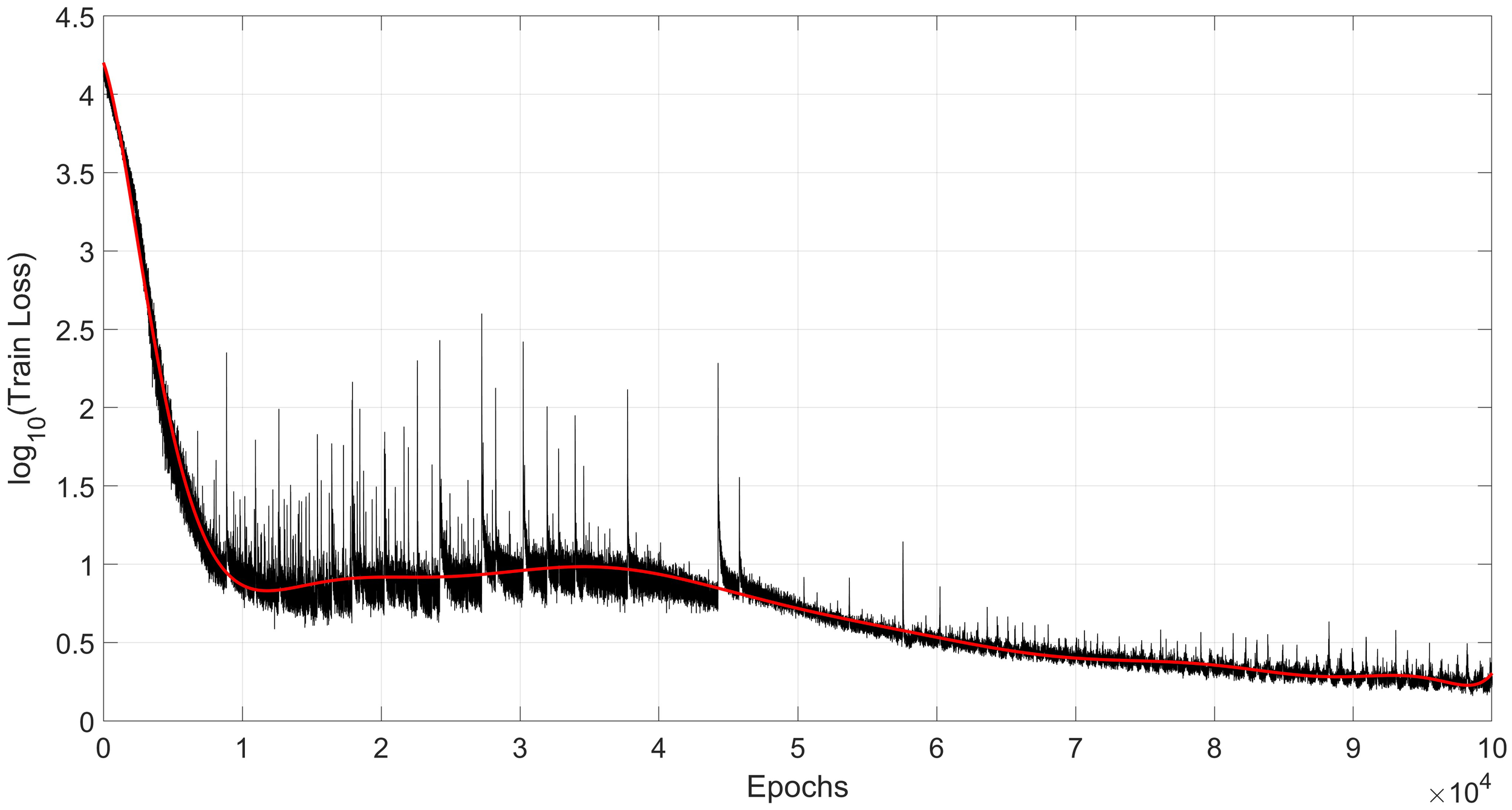 Plot of training loss versus number of iterations for the AB-LSTM and the AVISO sea surface height dataset. Due to the large span of the original training loss (Y-axis), to better show the trend of the change, we present it in logarithmic form, which results in the absence of some of the magnitude (the original magnitude is in cm), The black line is the original value of the training loss, and the red line is the error smoothing curve after 5-order Fourier fitting).