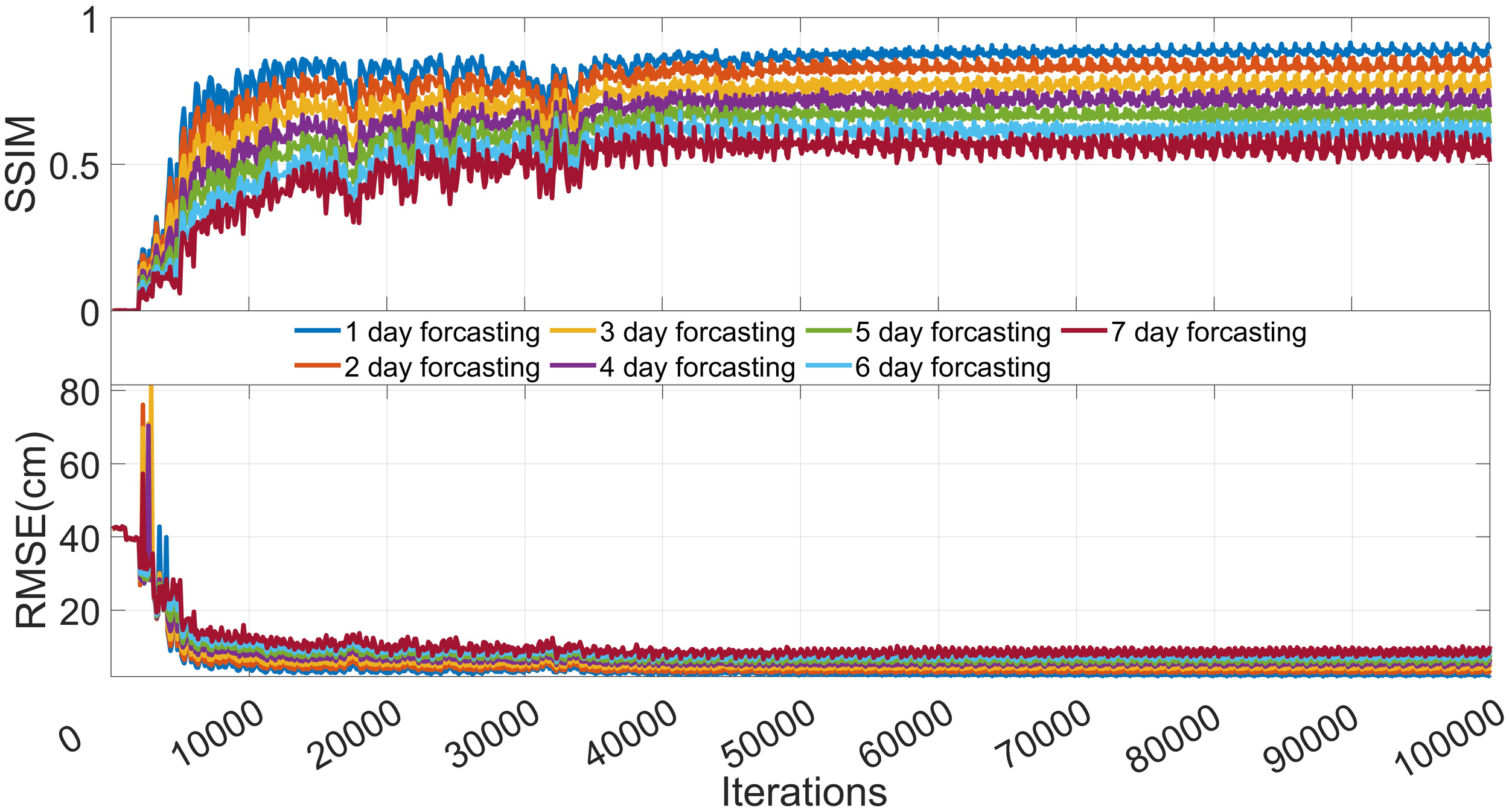 Figure 6 shows the effect of the prediction experiment for 7 days for different numbers of iterations. Intuitively, the prediction effect is good. As the number of iterations increases, the model prediction effect continues to improve. The effect tends to stabilise at 50,000 iterations, and the subsequent prediction results are not easily distinguished by the human eye. In addition, it can be seen that the prediction sequences for the different numbers of iterations exhibit good continuity of the overall trend, and the mesoscale eddy characteristics are more obvious, except for the test with 5000 iterations. This indicates that the training process is effective. Figure 7 shows the change trends of the RMSE and SSIM metrics for the AB-LSTM for the AVISO sea surface height dataset with increasing iteration numbers. It can be clearly seen that the results shown in Figure 7 are highly consistent with the prediction effect shown in Figure 6. This also shows that the selected metrics can accurately reflect the actual performance of the model in terms of the prediction process.