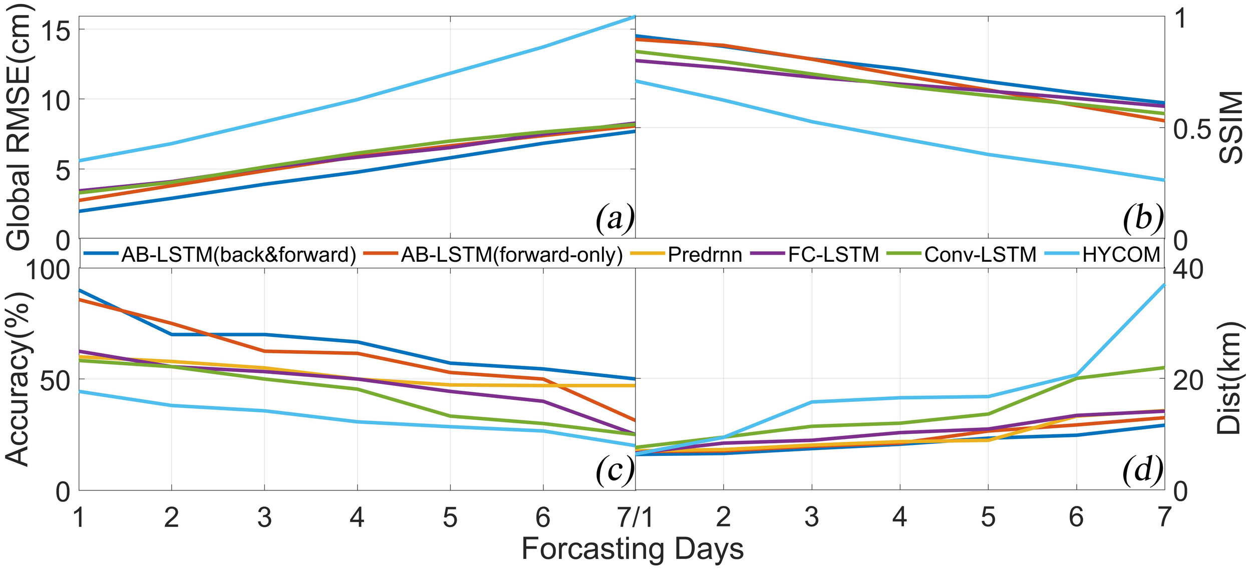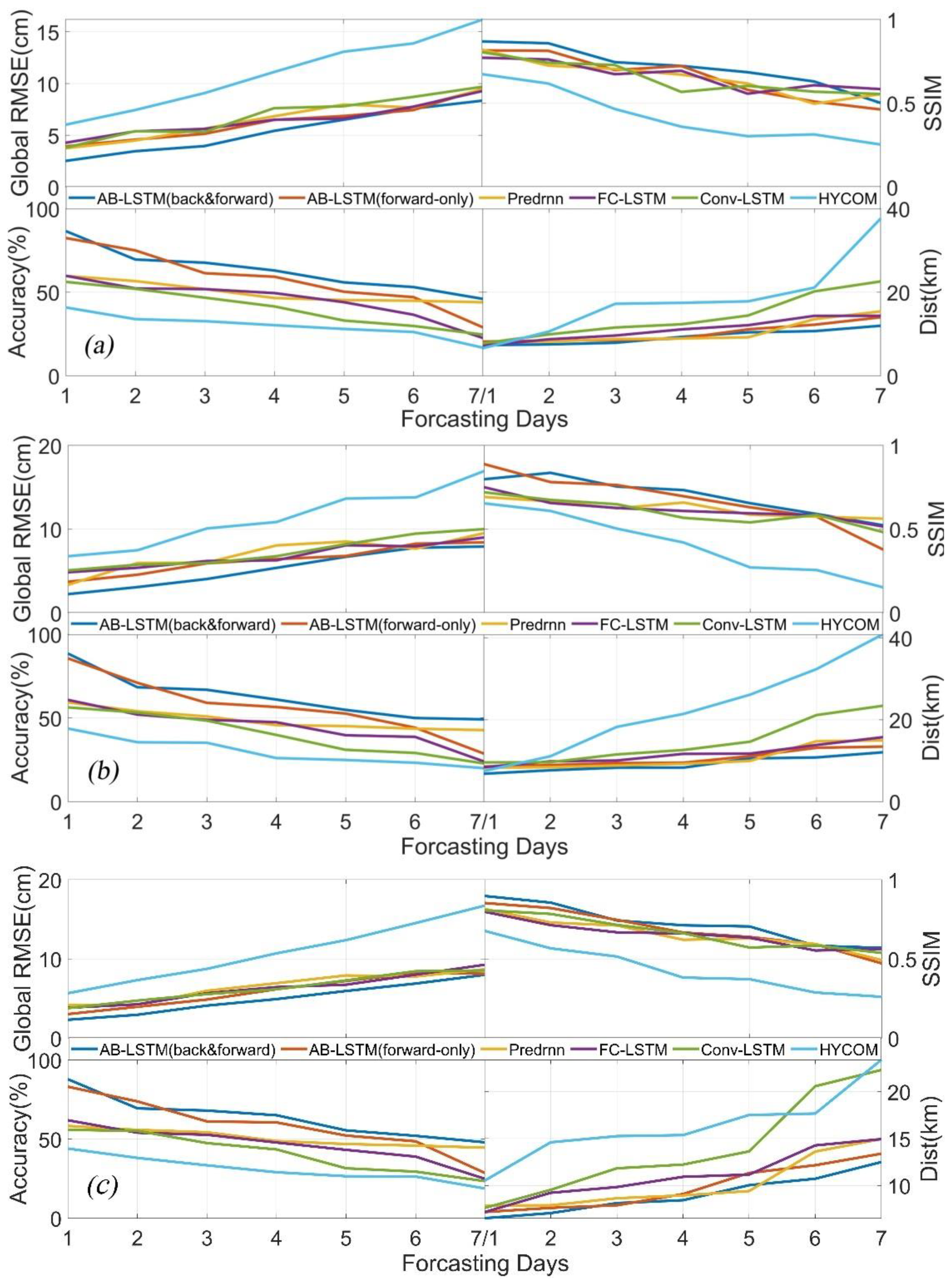 In this subsection, to demonstrate the feasibility and the advantages of the model, we compare the AB-LSTM with the HYCOM model forecast and the FC-LSTM (Srivastava et al., 2015), PredRNN (Wang et al., 2022), and Conv-LSTM (Shi et al., 2015) spatiotemporal prediction methods under the 3-4-3 input block conditions described in Section 4.1 and using the evaluation metrics described in Section 2.2.3. It is worth emphasizing that the horizontal comparison verification of the model should be discussed in different scenarios. For mesoscale vortices, the different properties of vortices and the setting of the research area are very important elements for scene division. Therefore, we will reflect the model verification effect under different research areas in the subsequent regional generalization verification. The model generalization test for differentiating AE and CE in a single eddy prediction scenario is also presented.