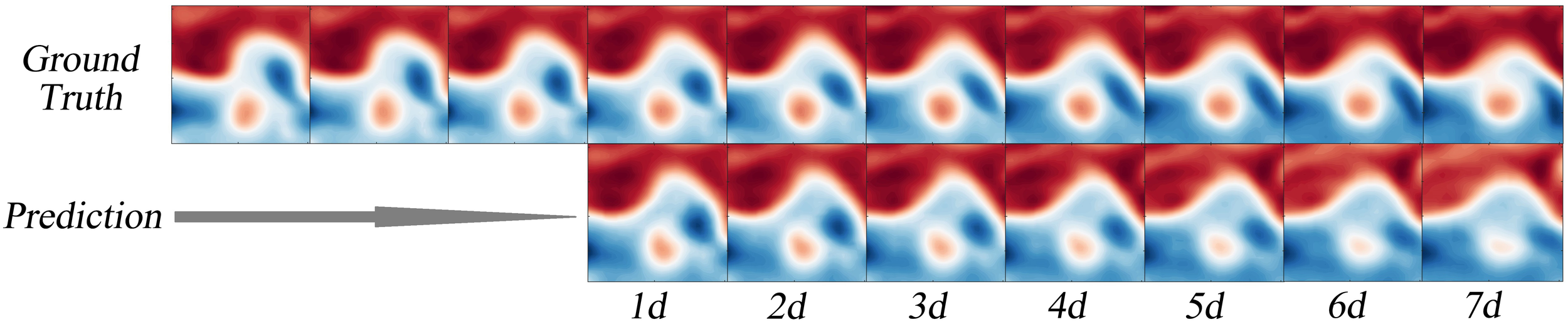In this subsection, first, we discuss the effect of different prediction lengths on prediction accuracy to confirm the optimal prediction range of the proposed model. Then, we conduct a multi-criteria comparison with the two modal datasets and a variety of existing spatiotemporal prediction models. Finally, we test the generalisation ability of the model using the day-by-day prediction history data from HYCOM. It should be noted that all input and output data used in this process are first interpolated to 128 × 128 using the interpolation method described in Section 2.2.2. Based on the conclusion of Ma et al. (Ma et al., 2019), the polarity of the mesoscale eddies has a limited effect on the smoothness, as well as the accuracy of the prediction process, so we do not take the issue of eddy polarity into account during the training process, but we do discuss it in the evaluation process.