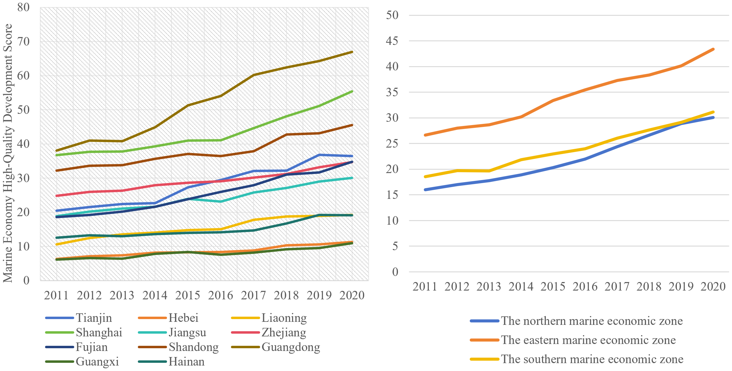 The growth of the marine industry and the expansion of the marine economy have led to noticeable disparities among coastal locations (Sun et al., 2018). These regional differences are significantly influenced by the uneven distribution of marine resources in China, which impacts both marine economic growth and industrial structure (Meng et al., 2024). To analyze these disparities, this paper categorizes the 11 coastal provinces into three regions based on the "Thirteenth Five-Year Plan for National Marine Economic Development" in Figure 1, in which the Northern Marine Economic Zone includes Liaoning, Hebei, Tianjin and Shandong, the Eastern Marine Economic Zone includes Jiangsu, Shanghai and Zhejiang, and the Southern Marine Economic Zone includes Fujian, Guangdong, Guangxi and Hainan. These regions, arranged from north to south, exhibit variations in marine economic growth due to diverse factors, including marine resources, environmental conditions, and economic foundations.